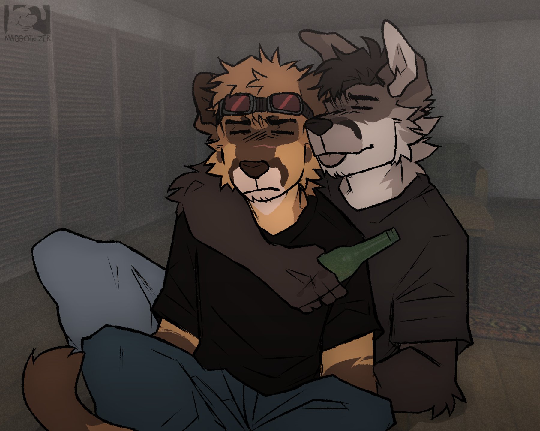 alcohol beer beer_bottle black_hair bottle brown_hair floor frown furry furry_male glass_bottle highres holding hug hug_from_behind maggotinzer pants rug scar shirt tongue tongue_out wooden_floor
