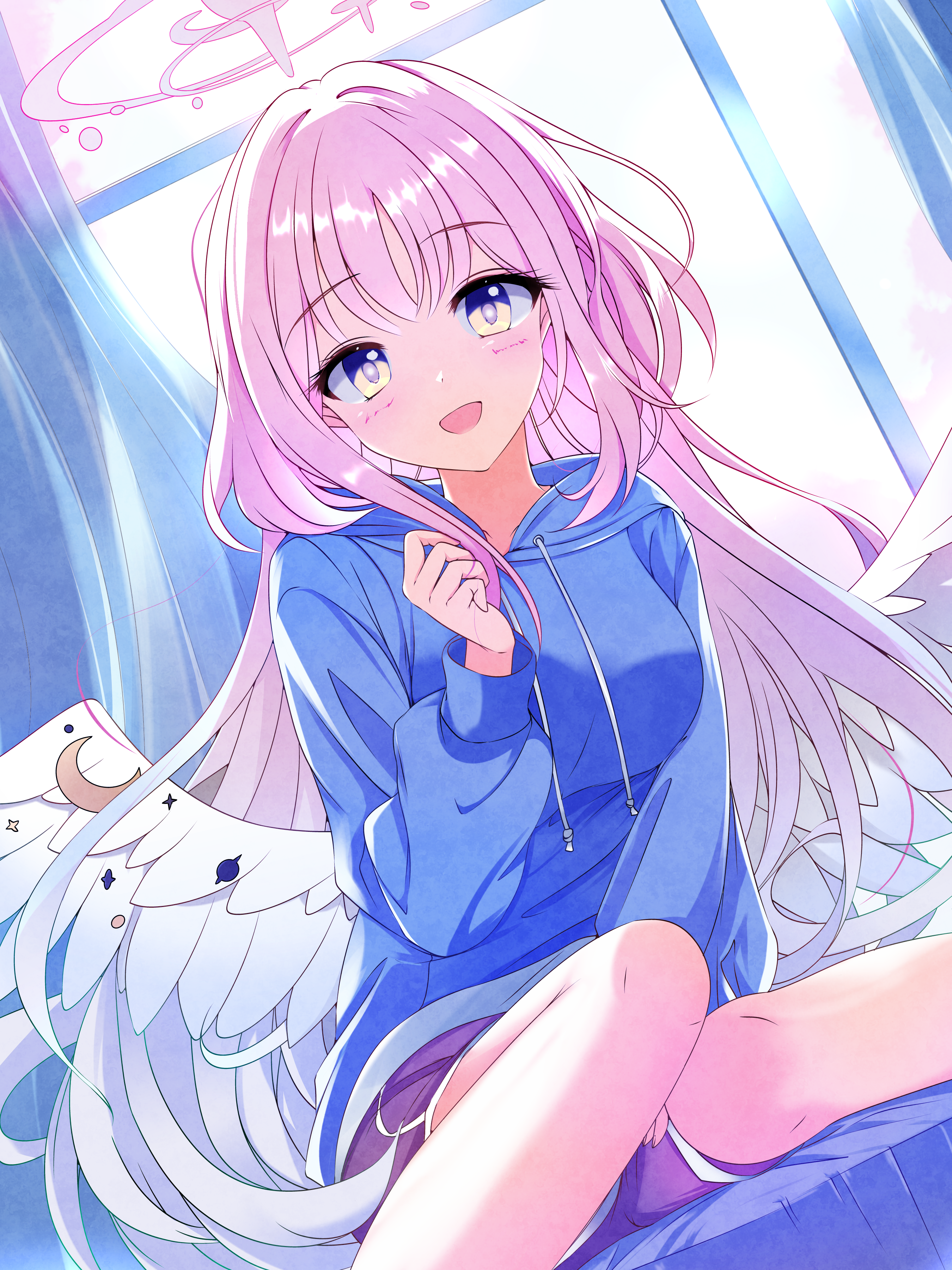 1girl :d absurdres alternate_costume blue_archive blue_hoodie blush breasts casual commentary_request crescent curtains dolphin_shorts dutch_angle eyelashes feathered_wings feet_out_of_frame furisuku_(gerbera) gradient_hair hair_down halo hand_up happy highres hood hood_down hoodie indoors large_breasts long_hair long_sleeves looking_at_viewer low_wings mika_(blue_archive) multicolored_hair open_mouth pink_hair pink_halo puffy_long_sleeves puffy_sleeves purple_shorts shorts sitting smile solo straight_hair very_long_hair wariza white_wings window wings yellow_eyes