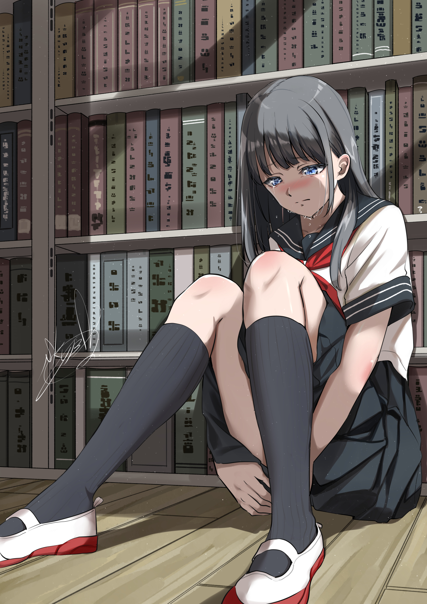 1girl black_hair black_sailor_collar black_skirt black_socks blue_eyes blush book bookshelf closed_mouth commentary_request crying crying_with_eyes_open facing_viewer full_body highres hugging_own_legs indoors kneehighs library long_hair looking_down neckerchief on_floor original red_neckerchief sailor_collar school_uniform serafuku shirt shoes short_sleeves signature sitting skirt socks solo soragane_(banisinngurei) tears uwabaki white_shirt white_shoes wooden_floor