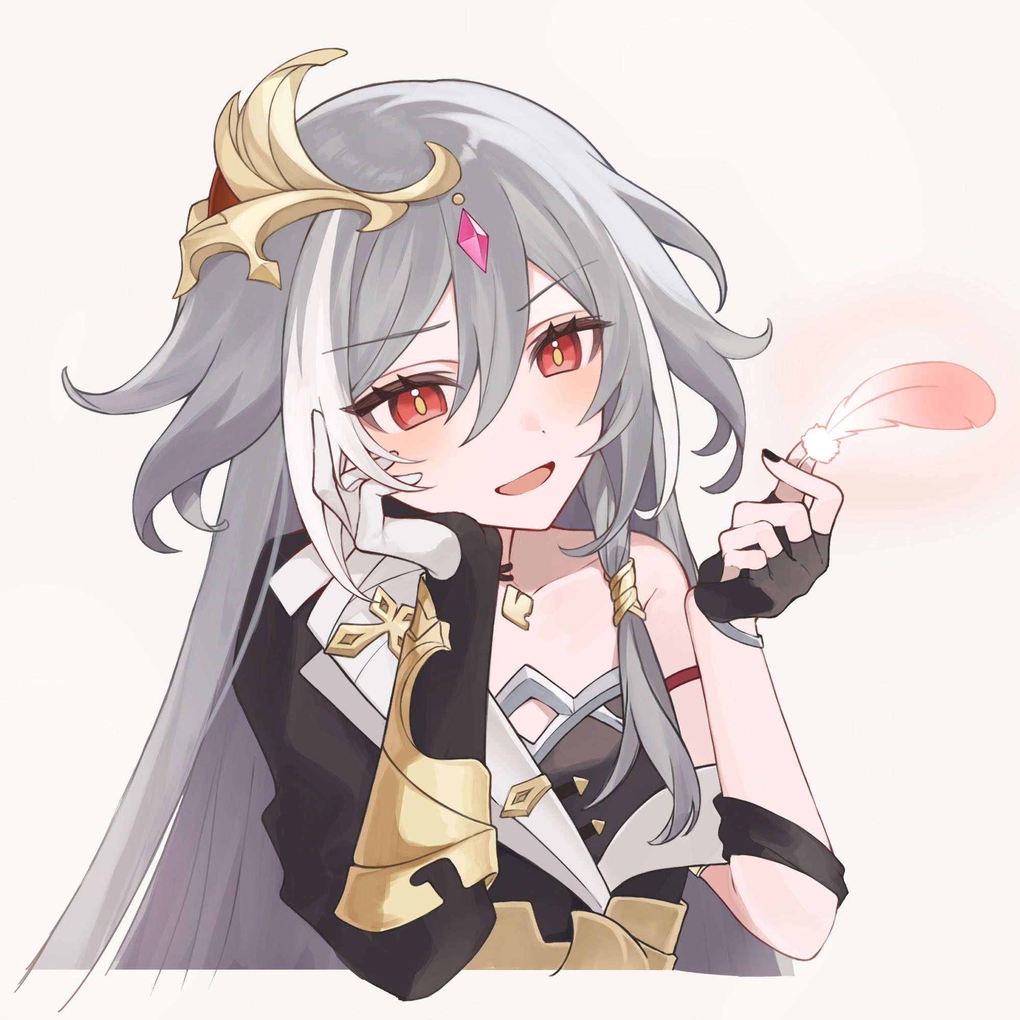 1girl commentary feathers grey_hair head_on_hand head_rest herrscher_of_sentience highres holding honkai_(series) honkai_impact_3rd kubikori long_hair multicolored_hair open_mouth smile solo streaked_hair untranslatable_commentary two-tone_hair white_hair