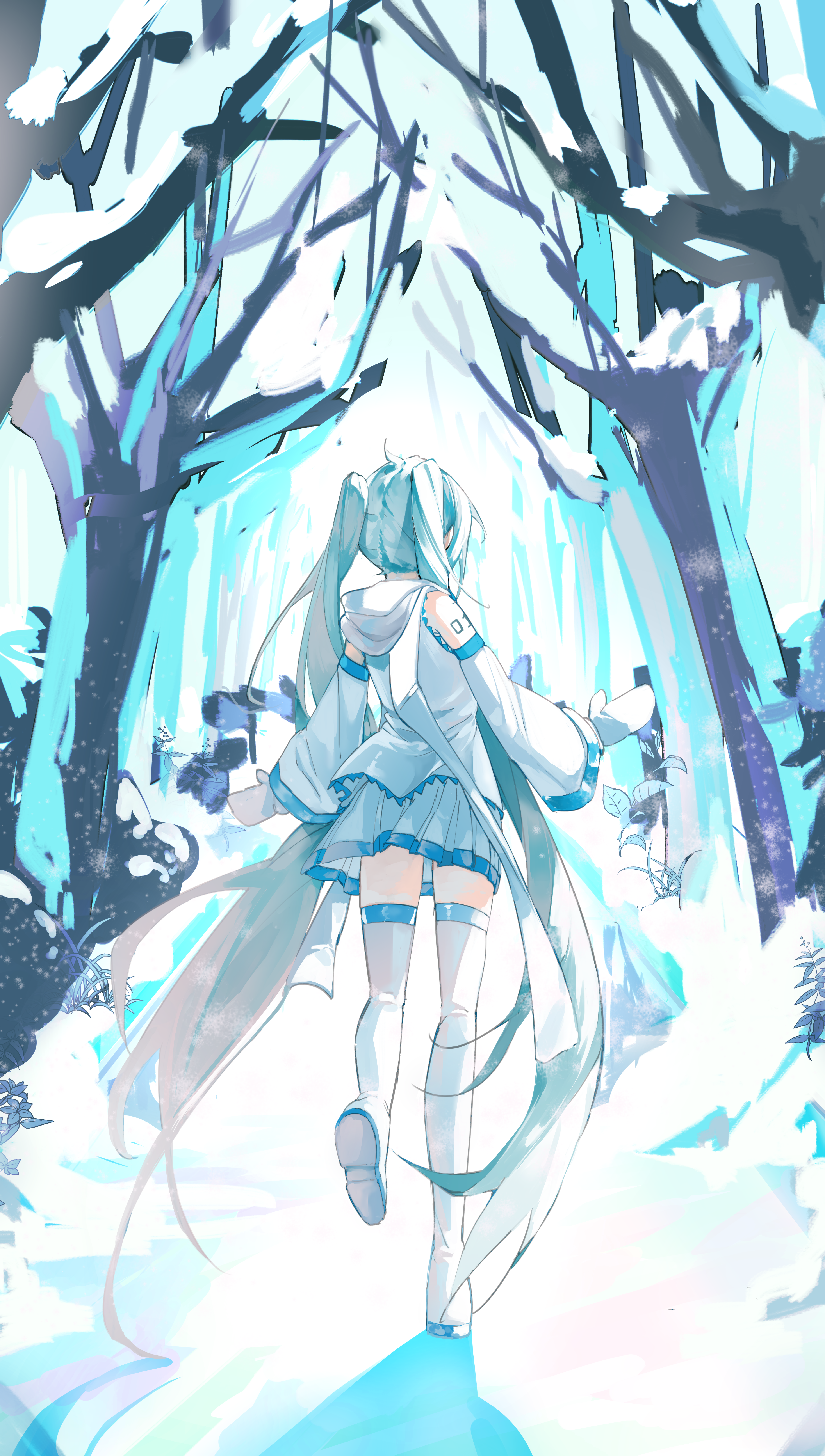 1girl absurdres aqua_hair bare_shoulders bare_tree boots commentary_request day detached_sleeves enddie1060_(tyasakura) facing_away from_behind full_body hatsune_miku highres leg_up long_hair long_sleeves mittens outdoors plant shoe_soles shoulder_tattoo sketch_background snow solo standing standing_on_one_leg tattoo thigh_boots tree twintails very_long_hair vocaloid white_boots white_mittens white_sleeves