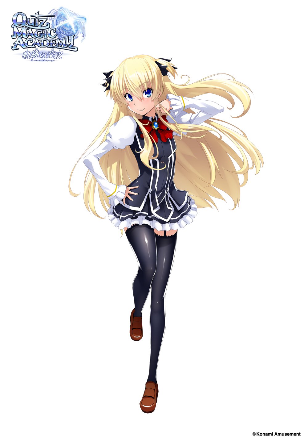 1girl arm_up black_thighhighs blonde_hair blue_eyes bow bowtie brooch commentary_request flat_chest frilled_skirt frills full_body garter_straps highres jacket jewelry loafers long_hair looking_at_viewer official_art qma_staff quiz_magic_academy red_bow red_bowtie shalon shoes skirt smile solo thighhighs two_side_up zettai_ryouiki