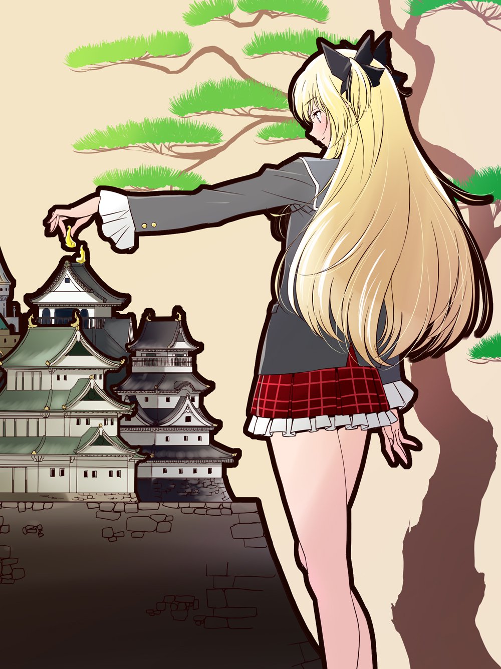1girl architecture blonde_hair bow commentary_request east_asian_architecture frilled_skirt frills from_behind hair_bow highres jacket japanese_castle long_hair miniature official_art profile qma_staff quiz_magic_academy shalon skirt smile solo tree two_side_up