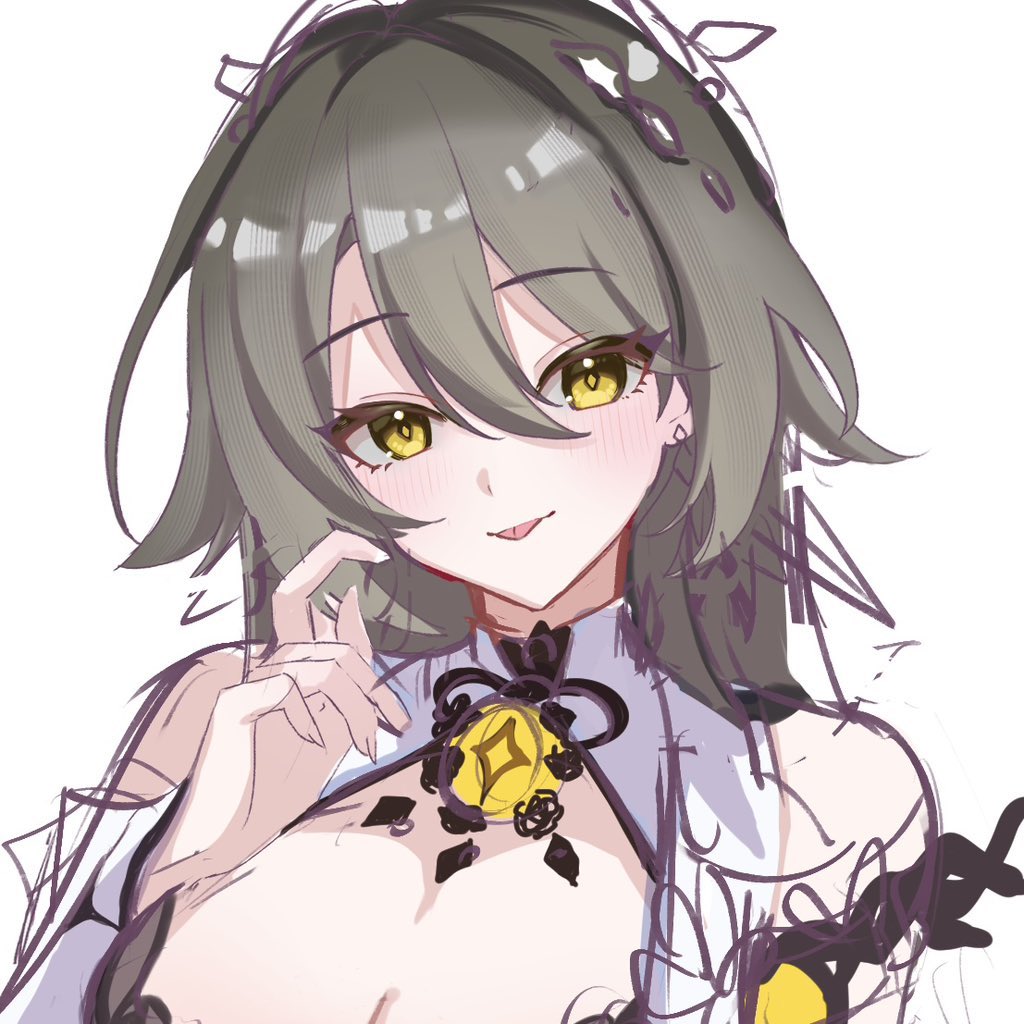 1girl bare_shoulders breasts cleavage grey_hair hair_between_eyes hair_ornament honkai_(series) honkai_impact_3rd light_blush looking_at_viewer portrait tdatnst tongue tongue_out vita_(eldritch_vantage)_(honkai_impact) white_background yellow_eyes