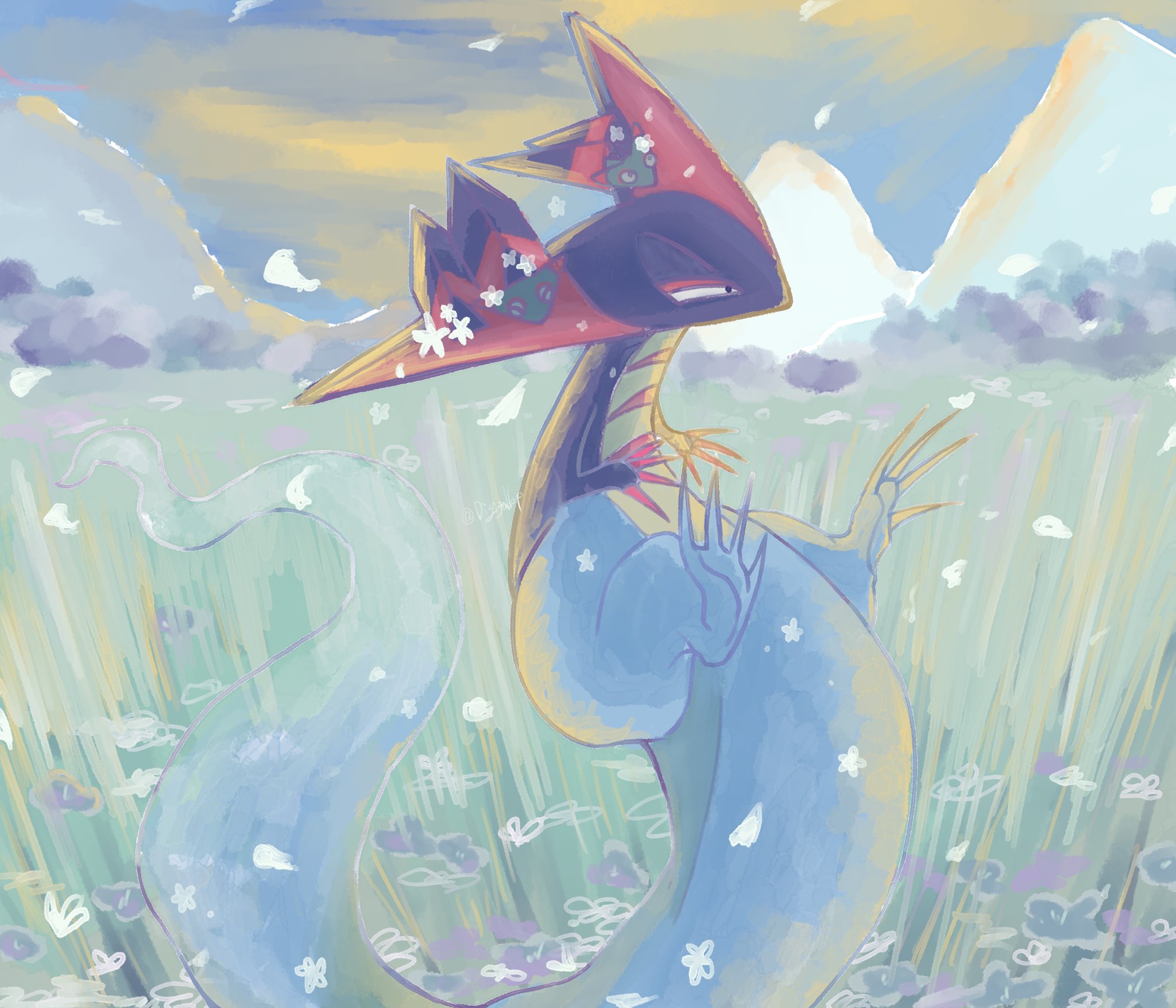 aqua_skin colored_skin digi_tallop dragapult dreepy falling_petals floating flower gen_8_pokemon head_wings highres meadow mountain nintendo no_humans petals pokemon pokemon_(creature) red_claws tail very_long_tail wings
