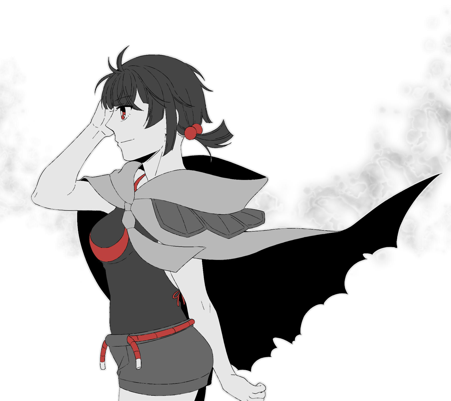 1girl cape from_side greyscale highres monochrome nintendo pokemon pokemon_oras ponytail red_eyes rope_belt short_hair short_ponytail shorts spot_color torn_cape torn_clothes unknown-amelia zinnia_(pokemon)