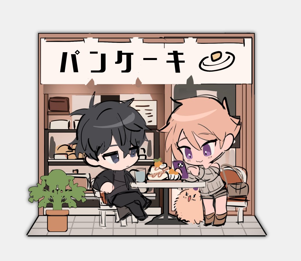 2boys :3 bag black_eyes black_hair black_jacket black_shirt blonde_hair blush boots cellphone chair chibi chinese_commentary commentary_request couple dog food grey_sweater hair_between_eyes handbag inbe_naoyuki_(ming) jacket long_sleeves looking_at_another looking_at_phone male_focus ming_(5unri5e666) momo_(ming) multiple_boys original pastry phone plant purple_eyes shirt short_hair shorts simple_background sitting smartphone sweater t-shirt translation_request trap white_background