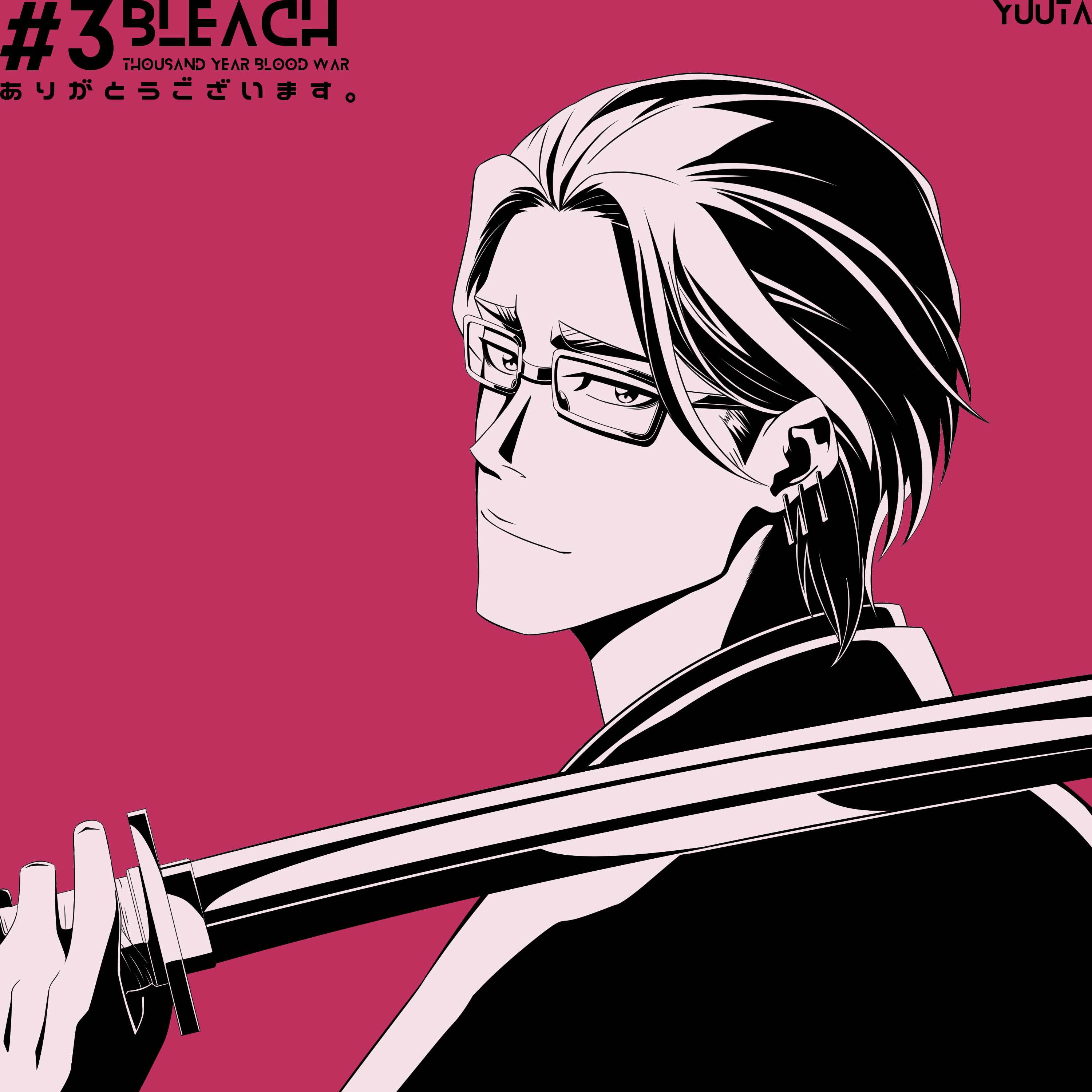 1boy absurdres artist_name bleach bleach:_sennen_kessen-hen close-up closed_mouth commentary_request copyright_name forehead from_behind glasses greyscale greyscale_with_colored_background hair_slicked_back highres holding holding_sword holding_weapon kajomaru_hidetomo katana looking_at_viewer looking_back male_focus mature_male monochrome nose official_style parted_bangs pink_background short_hair simple_background smile solo sword weapon yuuta_(yuuta0312)