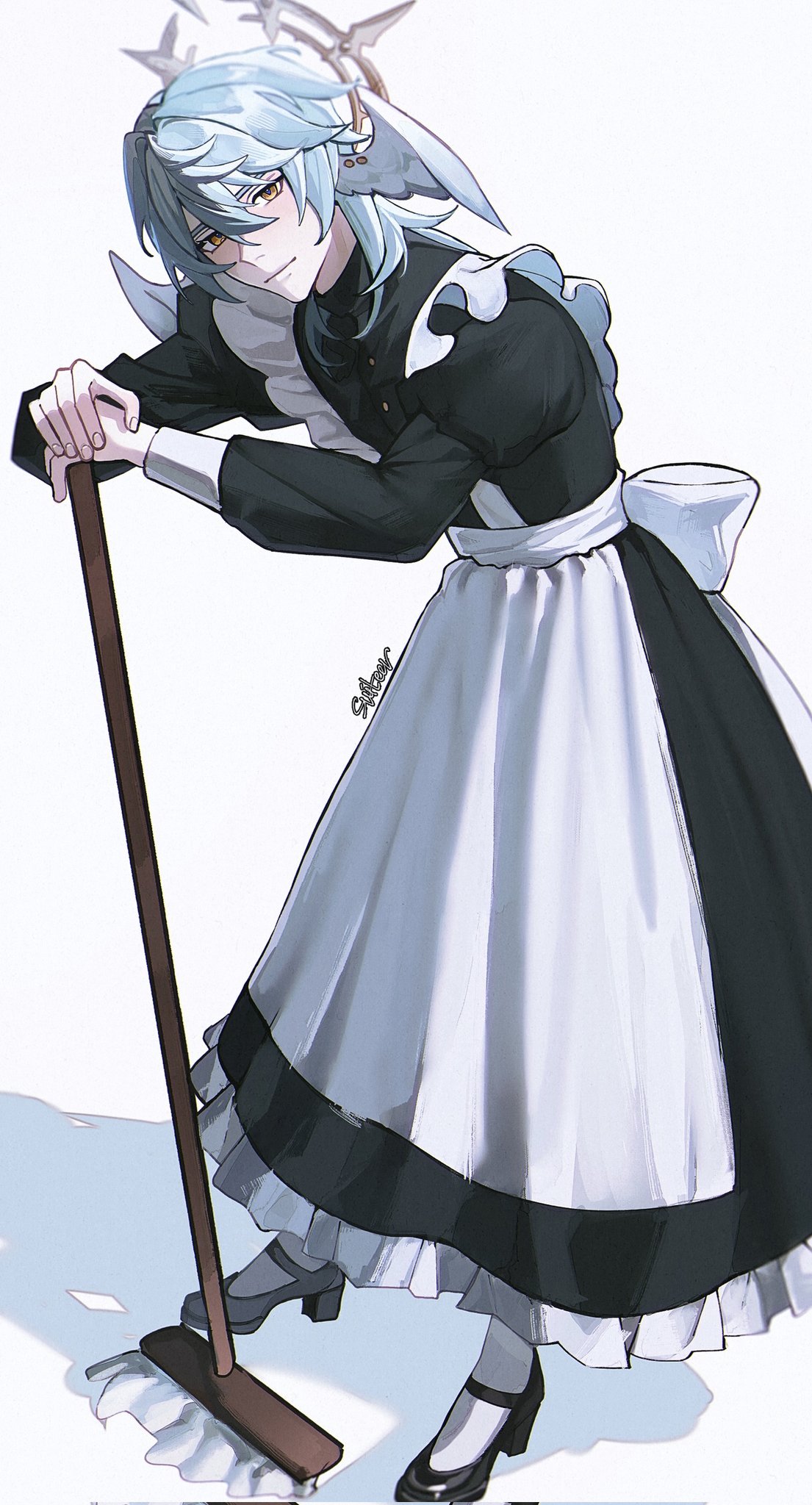 1boy alternate_costume apron black_dress black_shoes blue_eyes bow closed_mouth commentary dress english_commentary enmaided feathered_wings fingernails frilled_apron frilled_dress frills full_body hair_between_eyes halo halo_behind_head head_wings high_heels highres holding holding_mop honkai:_star_rail honkai_(series) long_dress long_hair long_sleeves looking_at_viewer maid maid_apron moonya mop piercing shoes solo sunday_(honkai:_star_rail) waist_bow white_apron white_bow white_wings wing_piercing wings yellow_eyes