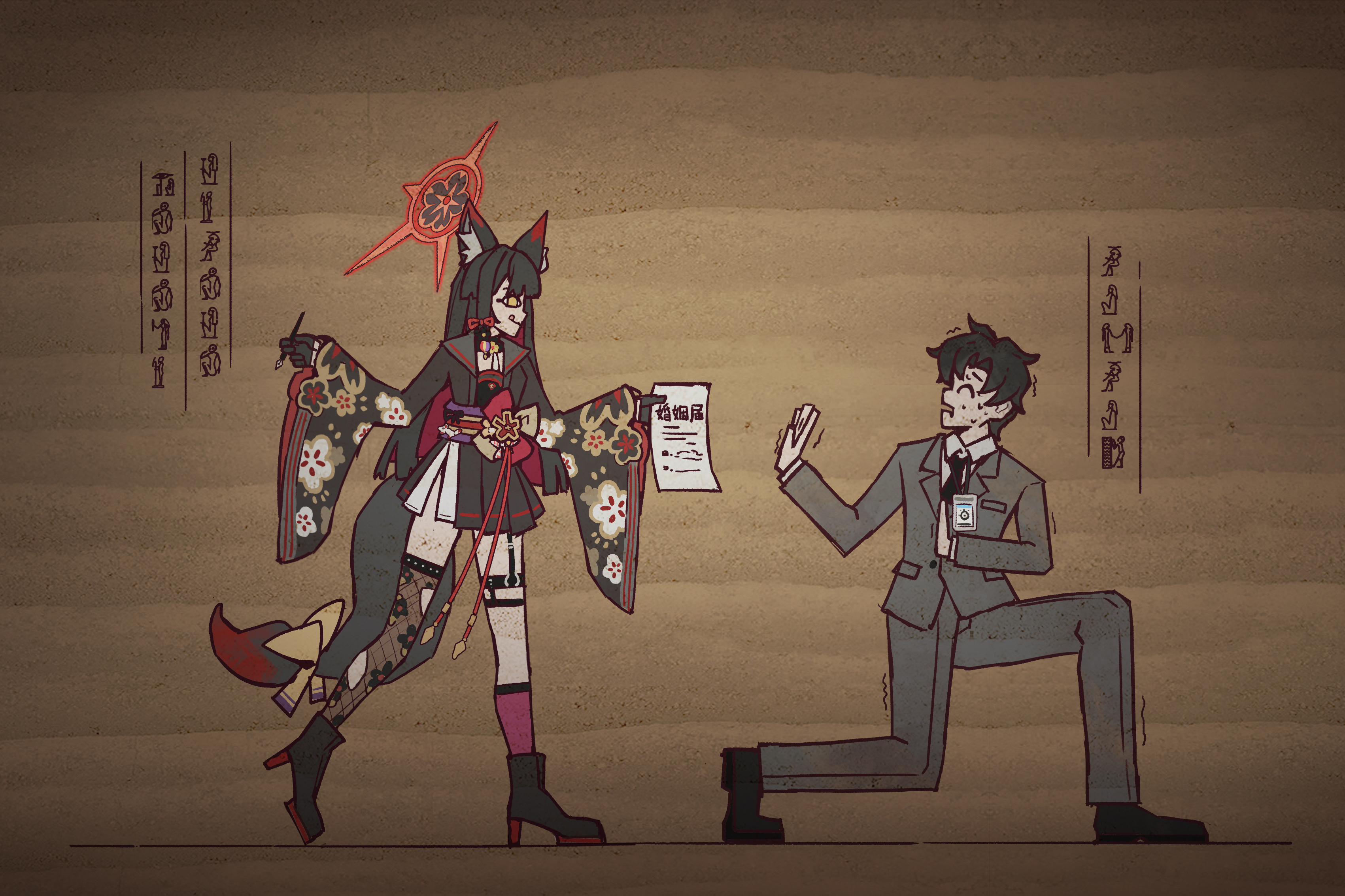 1boy 1girl :q ^_^ absurdres animal_ear_fluff animal_ears assertive_female asymmetrical_legwear black_footwear black_hair black_skirt blue_archive boots bow chinese_commentary closed_eyes closed_mouth commentary_request facing_another fishnet_thighhighs fishnets formal_clothes fox_ears fox_girl fox_tail full_body grey_sailor_collar grey_suit hair_bow halo hieroglyphics high_heel_boots high_heels highres holding holding_paper holding_pen id_card kevin_(reillymark1) kneeling long_hair long_sleeves looking_at_another marriage_certificate_(object) mismatched_legwear open_mouth paper pen pleated_skirt profile red_bow red_halo sailor_collar school_uniform serafuku short_hair skirt smile spiked_hair standing suit sweatdrop tail tail_bow tail_ornament thigh_strap thighhighs tongue tongue_out trembling wakamo_(blue_archive) wide_sleeves yellow_bow yellow_eyes zettai_ryouiki