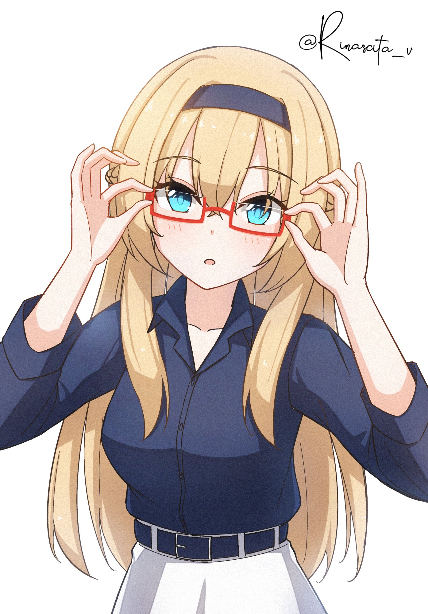 1girl aticsanir belt bespectacled black_belt black_hairband black_shirt blonde_hair blue_eyes dress_shirt glasses hairband highres kantai_collection long_hair official_alternate_costume one-hour_drawing_challenge red-framed_eyewear shirt simple_background skirt solo twitter_username upper_body warspite_(kancolle) warspite_(kure)_(kancolle) white_background white_skirt