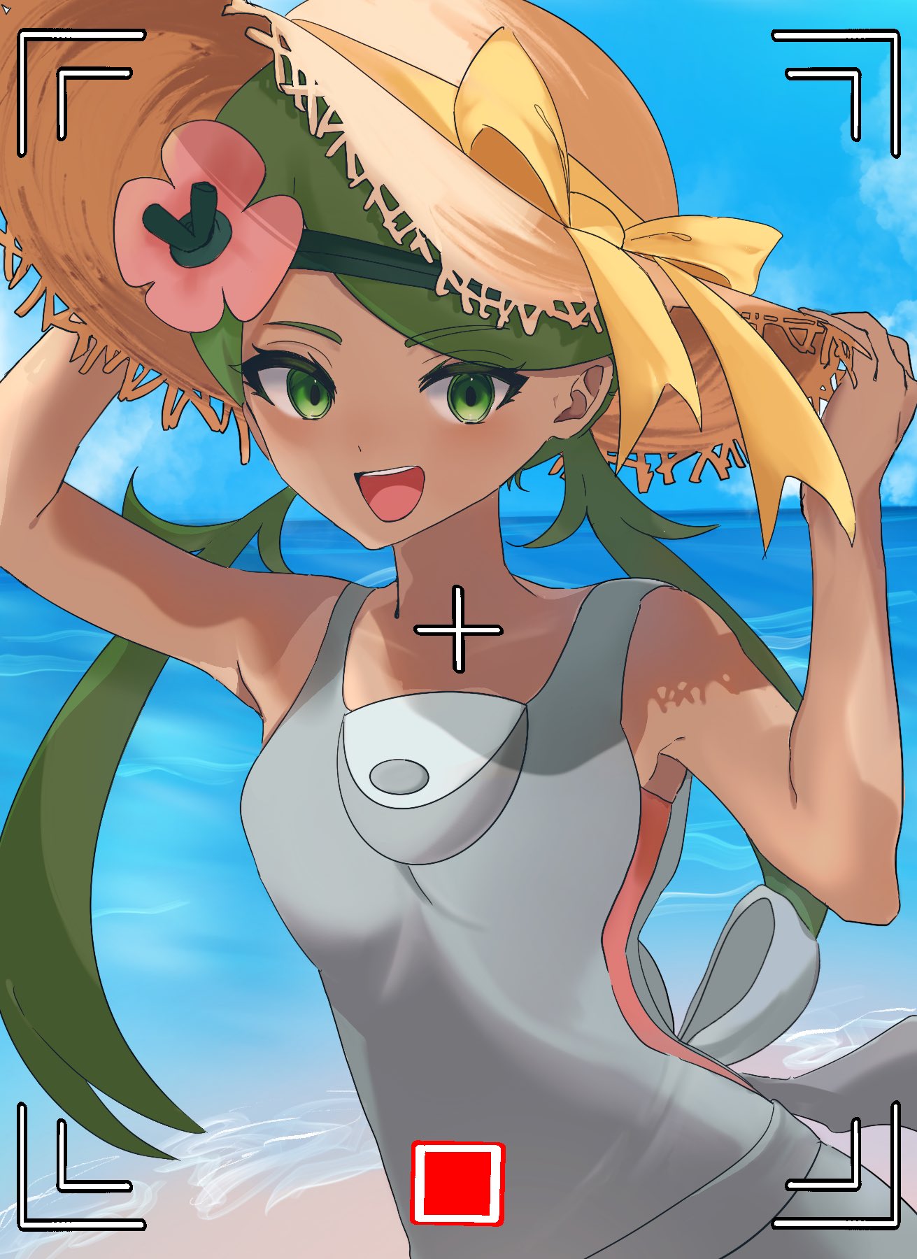 1girl anonymous84268 bare_shoulders beach dark-skinned_female dark_skin green_eyes green_hair hat highres mallow_(pokemon) nintendo ocean overalls pokemon pokemon_sun_and_moon sand sleeveless straw_hat water