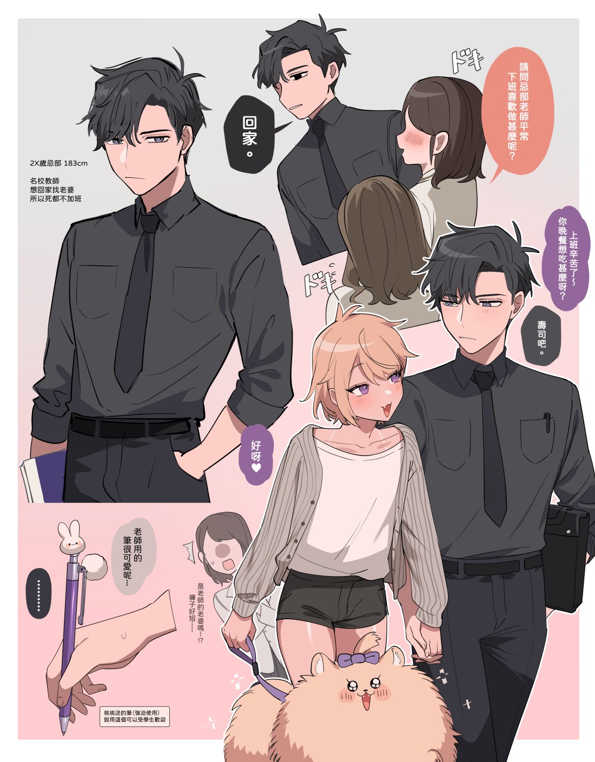 2boys 2girls :| belt black_hair black_necktie black_pants black_shirt blonde_hair blush border breast_pocket brown_hair chinese_commentary closed_mouth collarbone collared_shirt commentary_request couple dog eye_contact faceless faceless_female highres holding holding_hands holding_leash holding_pencil inbe_naoyuki_(ming) leash light_blush long_hair long_sleeves looking_at_another mechanical_pencil ming_(5unri5e666) momo_(ming) multiple_boys multiple_girls necktie original outside_border pants pen pencil pink_background pocket purple_eyes shirt short_hair simple_background sleeves_rolled_up sweater t-shirt tan tanline translation_request white_border white_shirt yaoi