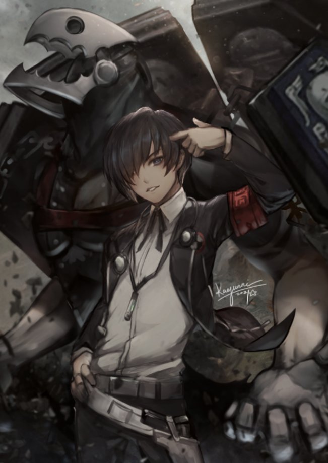 1boy arm_up armband belt black_hair black_jacket black_ribbon blue_eyes collared_shirt commentary curled_fingers mp3_player dress_shirt english_commentary gekkoukan_high_school_uniform hair_over_one_eye hand_on_own_hip jacket kaejunni layered_sleeves long_sleeves looking_at_viewer male_focus neck_ribbon one_eye_covered open_clothes open_jacket parted_lips persona persona_3 pointing pointing_at_self red_armband ribbon school_uniform shirt shirt_tucked_in signature smile thanatos_(persona) white_shirt yuuki_makoto_(persona_3)