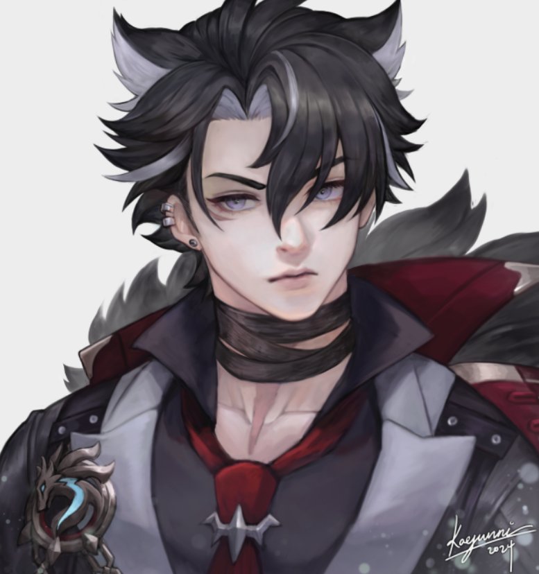 1boy black_fur black_hair black_jacket black_shirt blue_eyes closed_mouth collarbone collared_shirt colored_inner_hair commentary curtained_hair ear_piercing earrings english_commentary genshin_impact jacket jewelry kaejunni lapels looking_to_the_side male_focus multicolored_hair necktie parted_bangs piercing popped_collar red_necktie shirt sideways_glance signature solo streaked_hair stud_earrings upper_body white_background wriothesley_(genshin_impact)