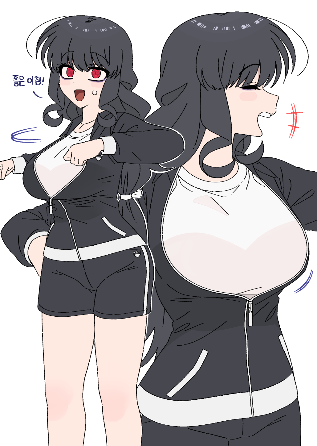 1girl bags_under_eyes black_hair black_jacket black_shorts blush breasts clenched_hands closed_eyes dot_nose feet_out_of_frame hair_tie highres jacket korean_text large_breasts long_hair long_sleeves looking_at_viewer motion_lines multiple_views nakta open_mouth partially_unzipped pocket profile red_eyes shirt short_shorts shorts sidelocks simple_background standing sweat teeth track_jacket upper_body upper_teeth_only wavy_hair white_background white_shirt yang_darae you're_under_my_skin! zipper zipper_pull_tab