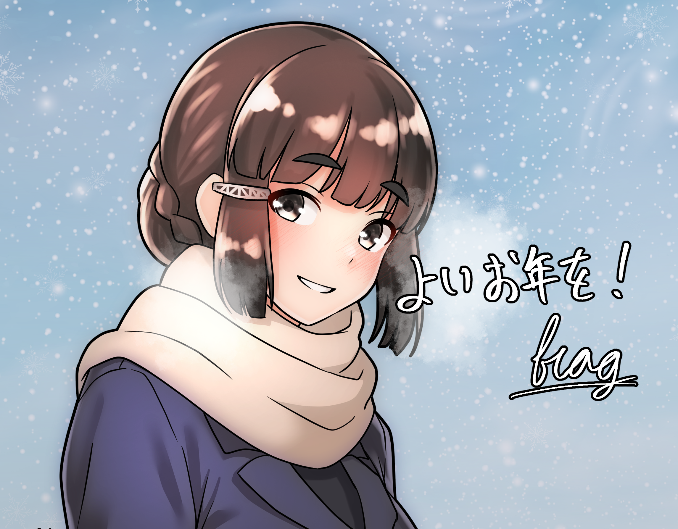 1girl alternate_costume black_eyes blue_jacket blunt_bangs blush breath brown_hair commentary_request furaggu_(frag_0416) hair_bun highres jacket kantai_collection looking_at_viewer medium_hair myoukou_(kancolle) open_mouth scarf sidelocks signature smile snow snowing solo teeth thick_eyebrows translation_request upper_body white_scarf winter_clothes