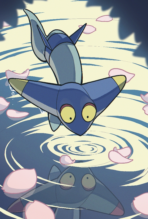 alternate_color aqua_skin aru_(citrine_drplt) black_eyes colored_sclera colored_skin dreepy floating gen_8_pokemon head_wings nintendo no_humans petals pink_petals pokemon pokemon_(creature) reflection reflective_liquid ripples shiny_and_normal shiny_pokemon water_drop wings yellow_sclera