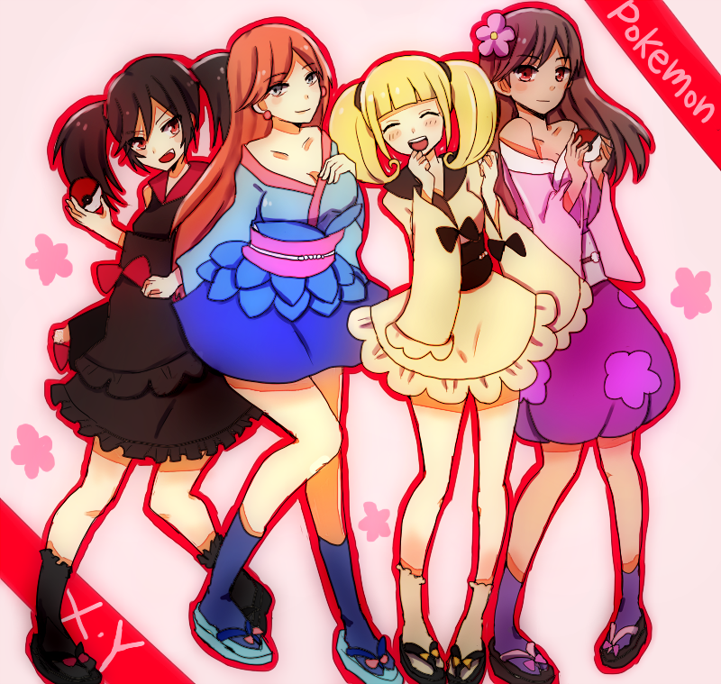 4girls :d black_footwear black_hair black_kimono black_sash black_socks blonde_hair blue_footwear blue_kimono blue_socks blush bow brown_eyes brown_hair closed_eyes closed_mouth copyright_name dark-skinned_female dark_skin floral_print floral_print_kimono flower furisode furisode_girl_(pokemon) furisode_girl_blossom furisode_girl_kali furisode_girl_katherine furisode_girl_linnea grey_eyes hair_flower hair_ornament holding holding_poke_ball japanese_clothes kimono long_hair mazeru_(jisjifin) multiple_girls nintendo obi open_mouth orange_hair outline pink_flower pink_kimono pink_sash platform_sandals poke_ball poke_ball_(basic) pokemon pokemon_x_and_y print_kimono purple_socks red_bow red_eyes red_outline sandals sash short_hair smile socks standing teeth twintails upper_teeth_only white_kimono white_socks