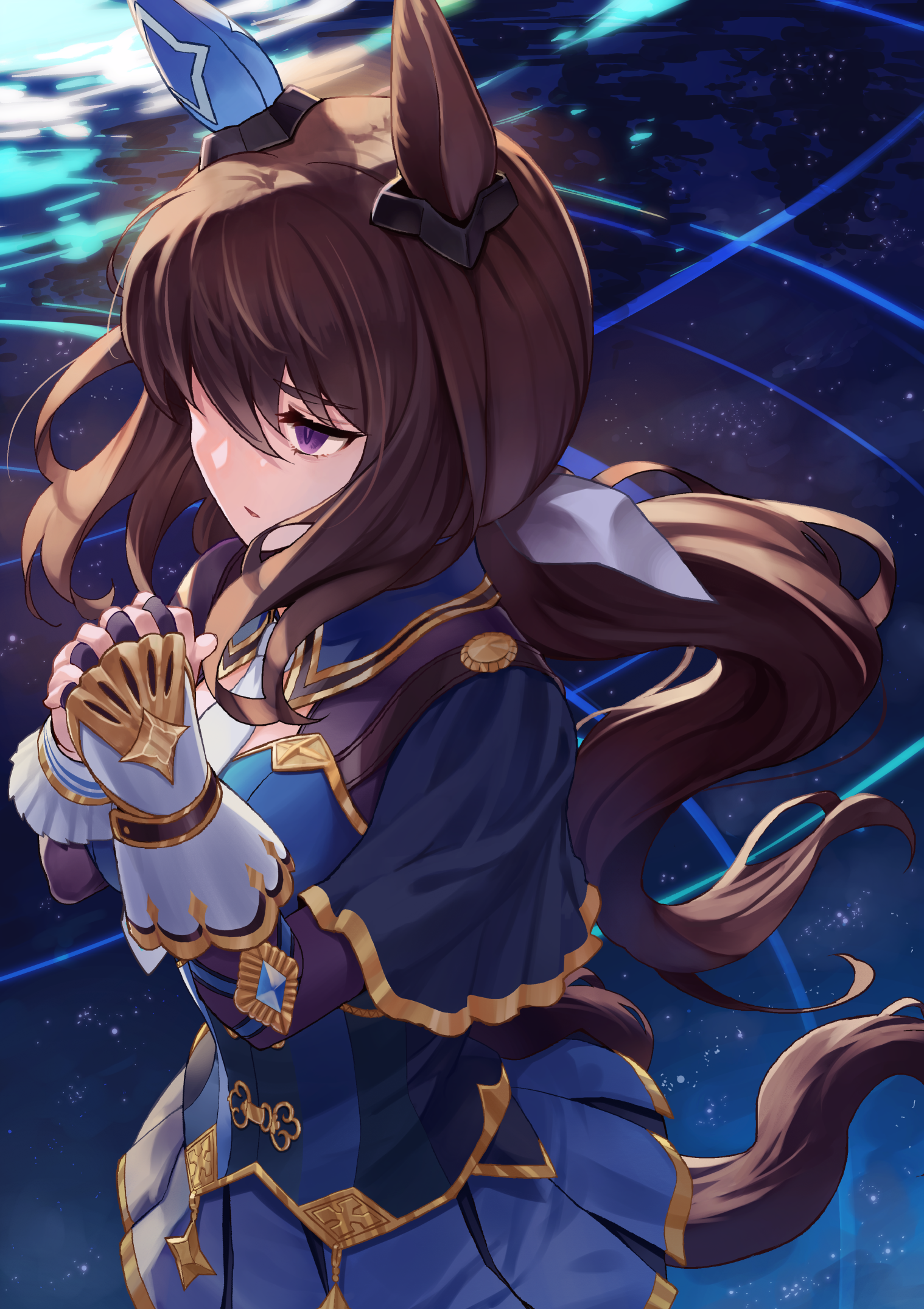 1girl admire_vega_(umamusume) animal_ears brown_hair commentary_request ear_covers from_above hair_over_one_eye hair_ribbon highres horse_ears horse_girl horse_tail long_hair long_sleeves low_ponytail necktie pleated_skirt ponytail purple_eyes ribbon shiro3necro single_ear_cover skirt solo tail umamusume white_necktie white_ribbon