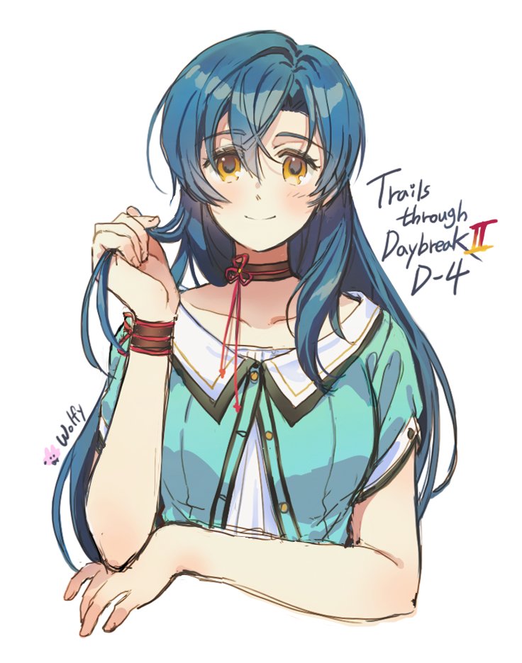 1girl artist_name black_choker blue_hair blush breasts chinese_knot choker closed_mouth collarbone commentary copyright_name countdown cropped_torso double-parted_bangs dress eiyuu_densetsu english_commentary green_jacket hair_between_eyes holding holding_own_hair jacket kuro_no_kiseki kuro_no_kiseki_(series) kuro_no_kiseki_i kuro_no_kiseki_ii long_hair looking_at_viewer medium_breasts neck_ribbon nina_fenly orange_eyes partially_unbuttoned red_ribbon ribbon simple_background smile solo upper_body white_background white_dress wolfyinthecity wristband