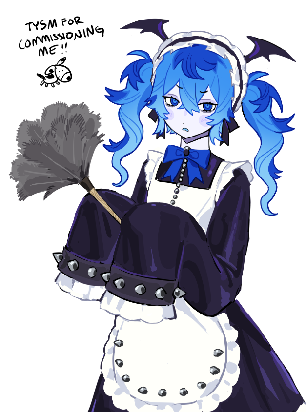 1girl apron blue_eyes blue_hair blue_ribbon commentary commission english_commentary hair_between_eyes hands_up head_wings holding maid_apron maid_headdress mota_(motaberrie) neck_ribbon original ribbon simple_background sleeves_past_fingers sleeves_past_wrists solo thank_you white_background wings
