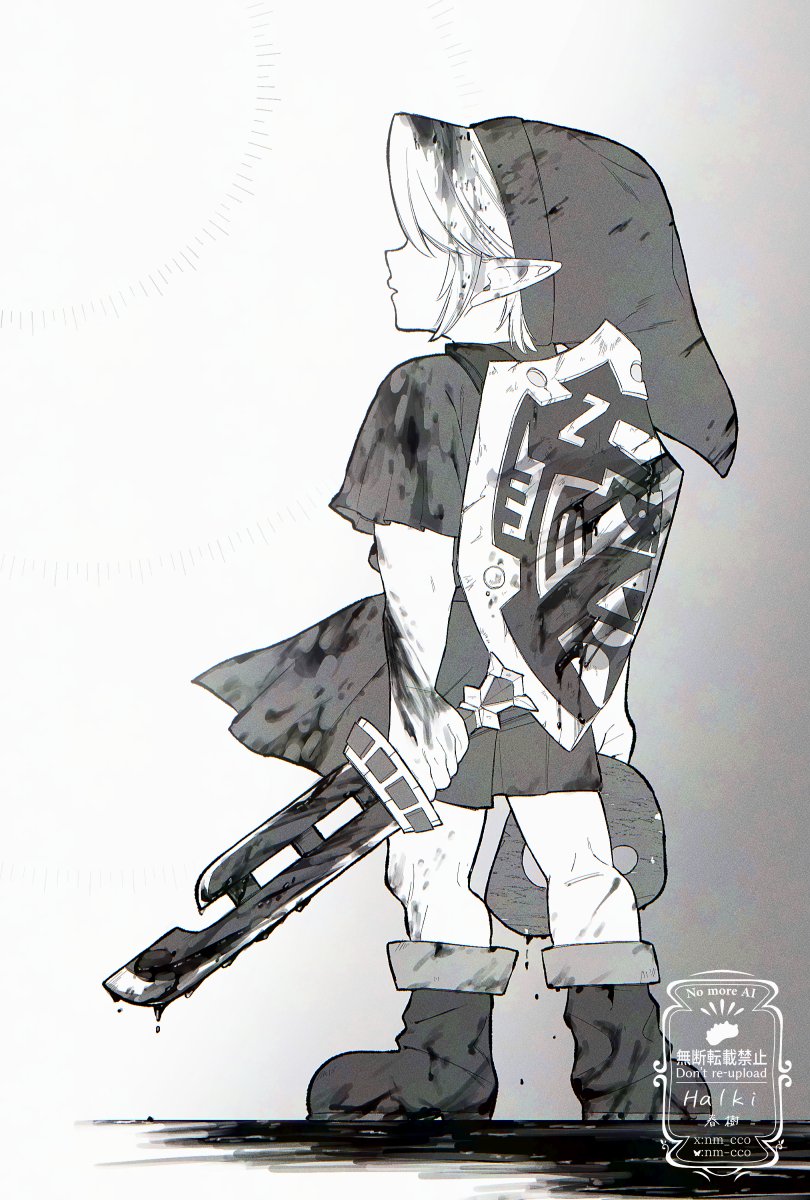 1boy ao_haruki blood blood_on_clothes blood_on_hands boots from_behind full_body greyscale hat highres holding holding_shield holding_sword holding_weapon link monochrome nintendo pointy_ears razor_sword shield shield_on_back solo standing sword the_legend_of_zelda the_legend_of_zelda:_majora's_mask tunic weapon young_link