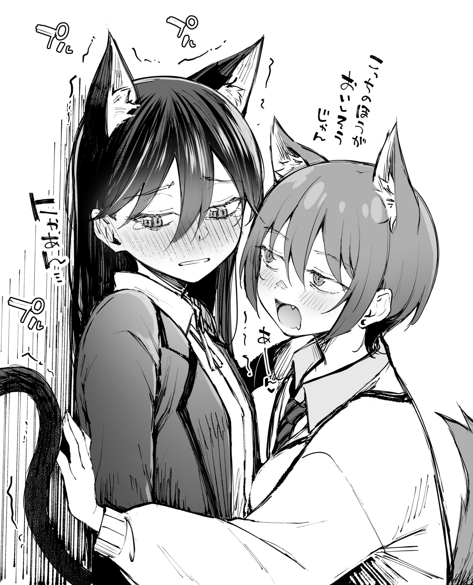 2girls :d :| against_wall amate_yuzuriha animal_ear_fluff animal_ears blush breasts cardigan cat_ears cat_girl cat_tail closed_mouth collared_shirt commentary_request double-parted_bangs dress_shirt fang greyscale gundam gundam_gquuuuuux hair_between_eyes highres jacket kitaku_(nakamachi_machi) long_hair long_sleeves medium_breasts monochrome multiple_girls necktie nose_blush nyaan_(gundam_gquuuuuux) open_clothes open_jacket open_mouth parted_lips pinned shirt short_hair smile tail tearing_up upper_body yuri