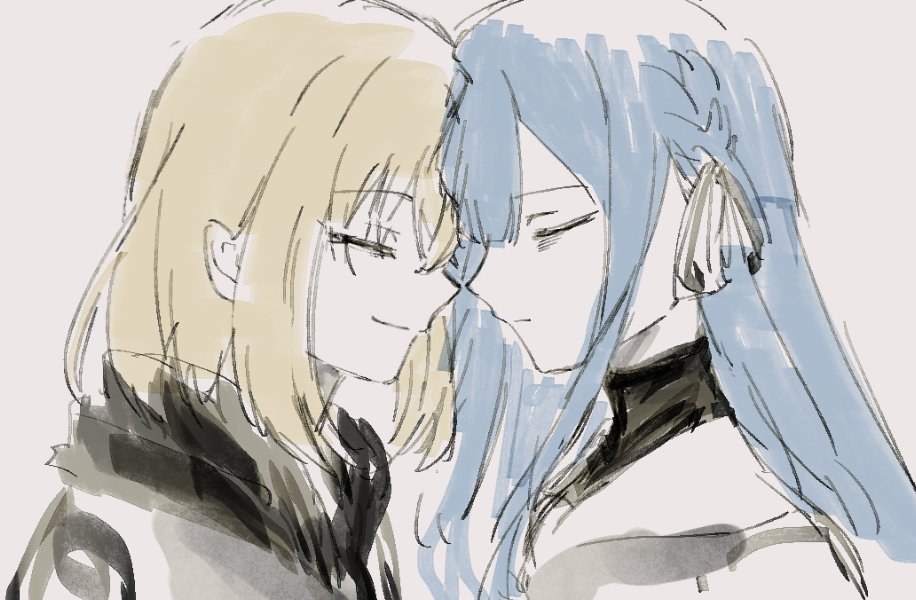 2girls bang_dream! bang_dream!_it's_mygo!!!!! blonde_hair blue_hair braid closed_eyes closed_mouth commentary forehead-to-forehead giovanni_(polymuji) heads_together long_hair medium_hair misumi_uika multiple_girls sidelocks simple_background togawa_sakiko white_background yuri
