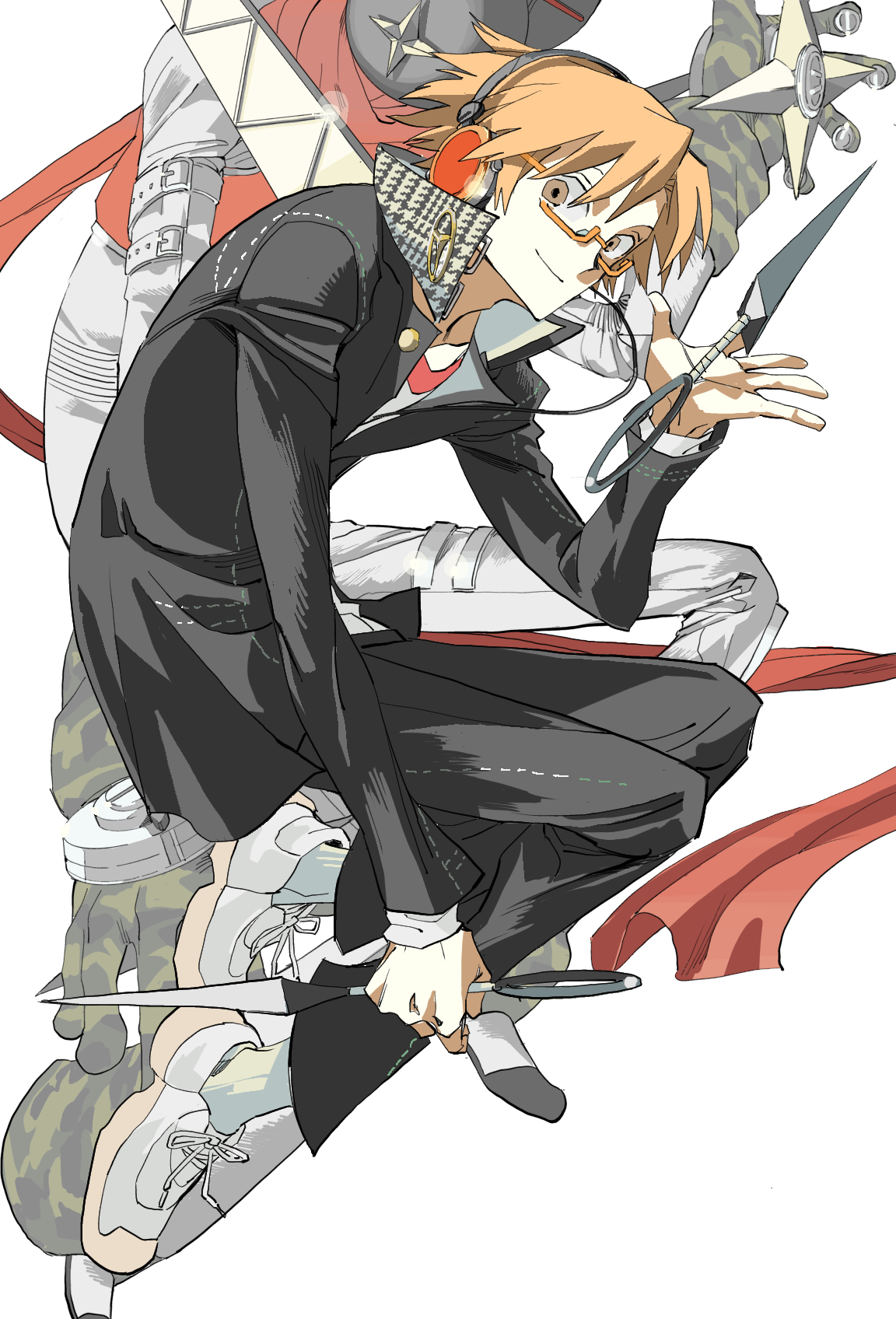 1boy black_jacket black_pants brown_eyes brown_hair full_body hanamura_yousuke headphones high_collar highres holding holding_weapon jacket jiraiya_(persona_4) kunai male_focus orange-framed_eyewear pants partially_unbuttoned persona persona_4 pure_to_ma red_scarf scarf school_uniform shirt shoes short_hair simple_background smile weapon white_background white_shirt white_shoes yasogami_school_uniform