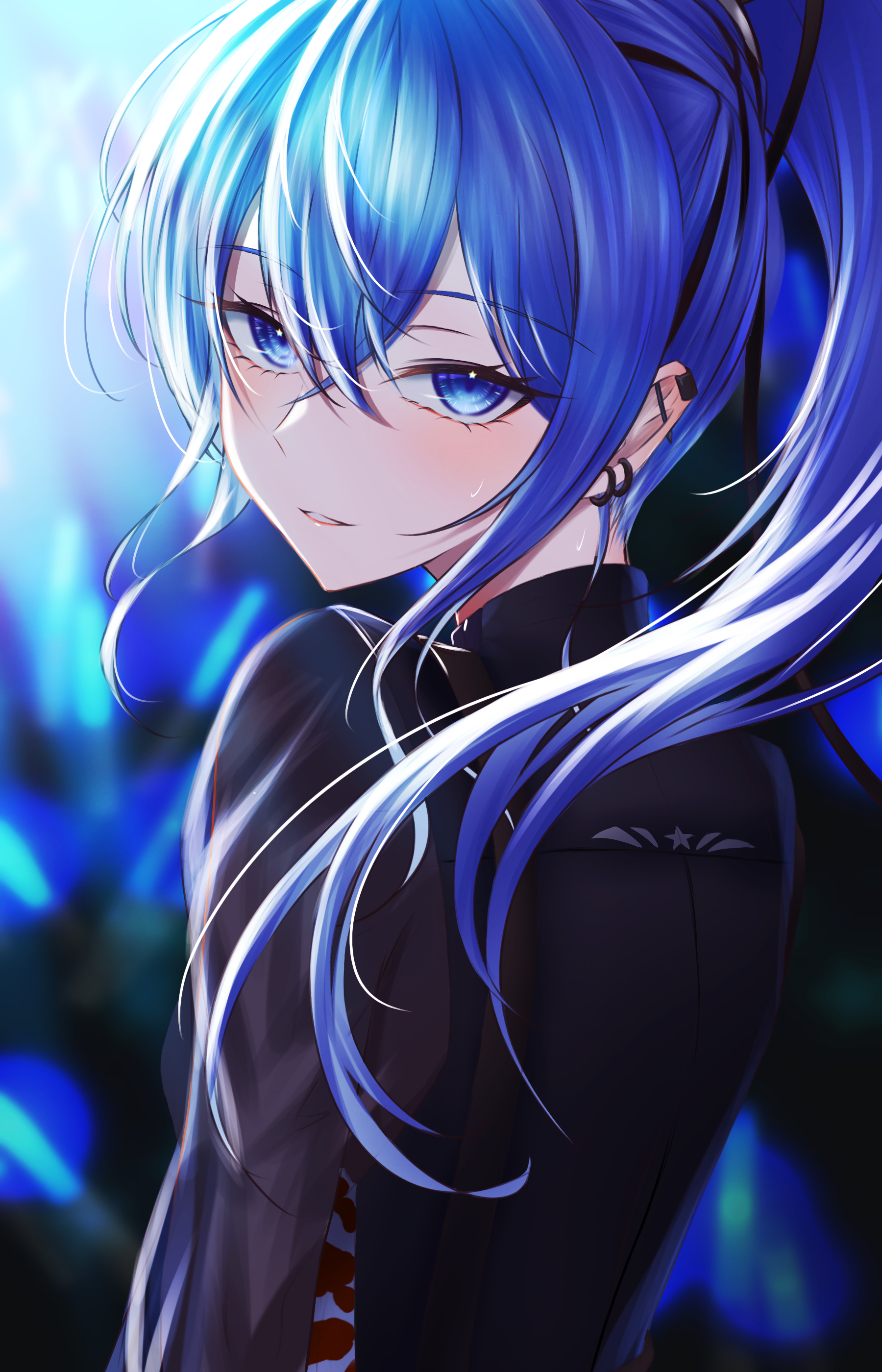 1girl absurdres barbell_piercing black_shirt blue_eyes blue_hair crossed_bangs ear_piercing earrings from_behind high_ponytail highres hololive hoshimachi_suisei hoshimachi_suisei_(shout_in_crisis) jewelry long_hair long_sleeves looking_at_viewer looking_back multiple_piercings nisikm official_alternate_costume official_alternate_hairstyle parted_lips piercing ponytail shirt solo star_(symbol) star_in_eye symbol_in_eye upper_body virtual_youtuber