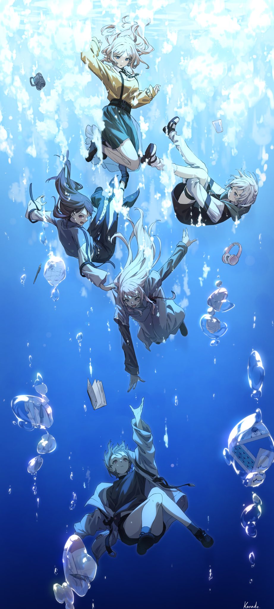 5girls air_bubble artist_name asymmetrical_legwear bandaid bang_dream! bang_dream!_it's_mygo!!!!! black_hoodie black_shoes black_shorts blue_eyes brown_eyes brown_hair bubble camcorder chihaya_anon commentary dress falling fishnets green_skirt grey_dress grey_eyes grey_hair grey_shirt headphones heterochromia highres hood hood_down hoodie hugging_own_legs jacket kanade_(kanade_3344) kaname_raana long_hair long_sleeves midriff_peek mitsuketa_keshiki_tazusaete multiple_girls mygo!!!!!_(bang_dream!) nagasaki_soyo open_mouth parted_lips pen pink_hair reaching shiina_taki shirt shoes short_hair shorts single_thighhigh skirt socks sweater takamatsu_tomori thighhighs togawa_sakiko video_camera white_hair white_jacket white_socks white_thighhighs yellow_eyes yellow_sweater