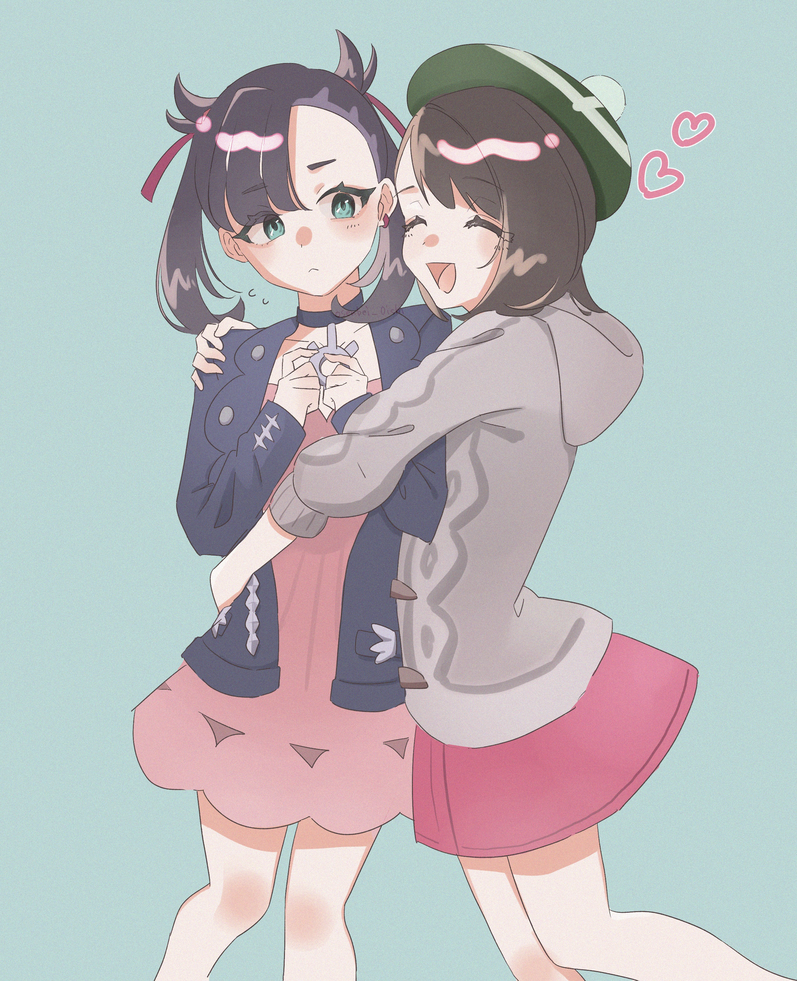 2girls :d absurdres asymmetrical_bangs black_choker cardigan choker closed_eyes commentary_request dress flying_sweatdrops gloria_(pokemon) green_background green_hat grey_cardigan hair_ribbon hat heart highres hood hood_down hooded_cardigan hug jacket marnie_(pokemon) medium_hair multiple_girls nintendo open_clothes open_jacket open_mouth osenbei_0ishi pink_dress pokemon pokemon_sword_and_shield ribbon simple_background smile tam_o'_shanter tongue undercut yuri