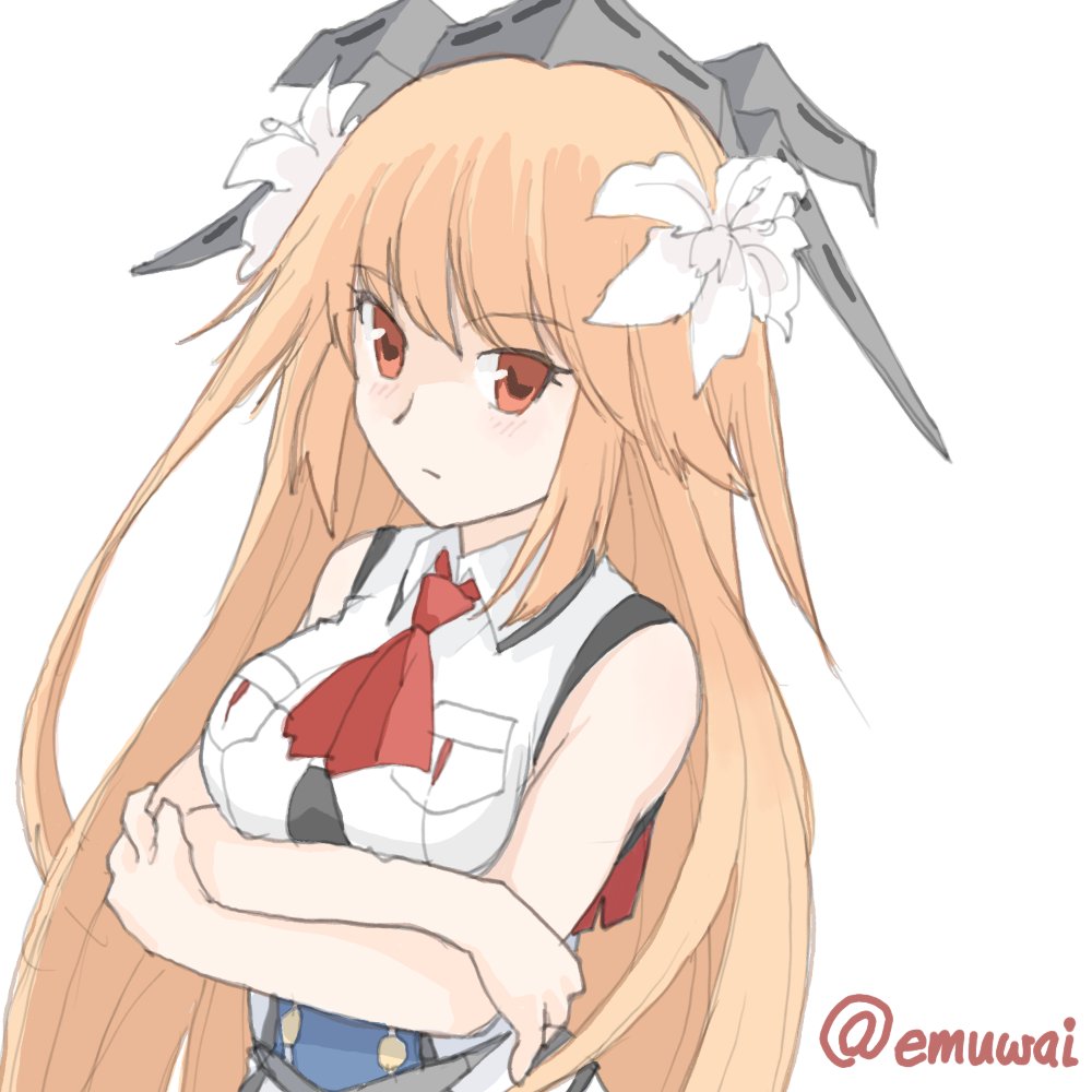 1girl ascot blonde_hair breast_pocket breasts brooklyn_(kancolle) crossed_arms emuwai flower hair_flower hair_ornament headgear kantai_collection large_breasts long_hair looking_at_viewer military_uniform orange_eyes pocket red_ascot simple_background sleeveless sleeveless_jacket solo twitter_username undershirt upper_body white_background white_flower