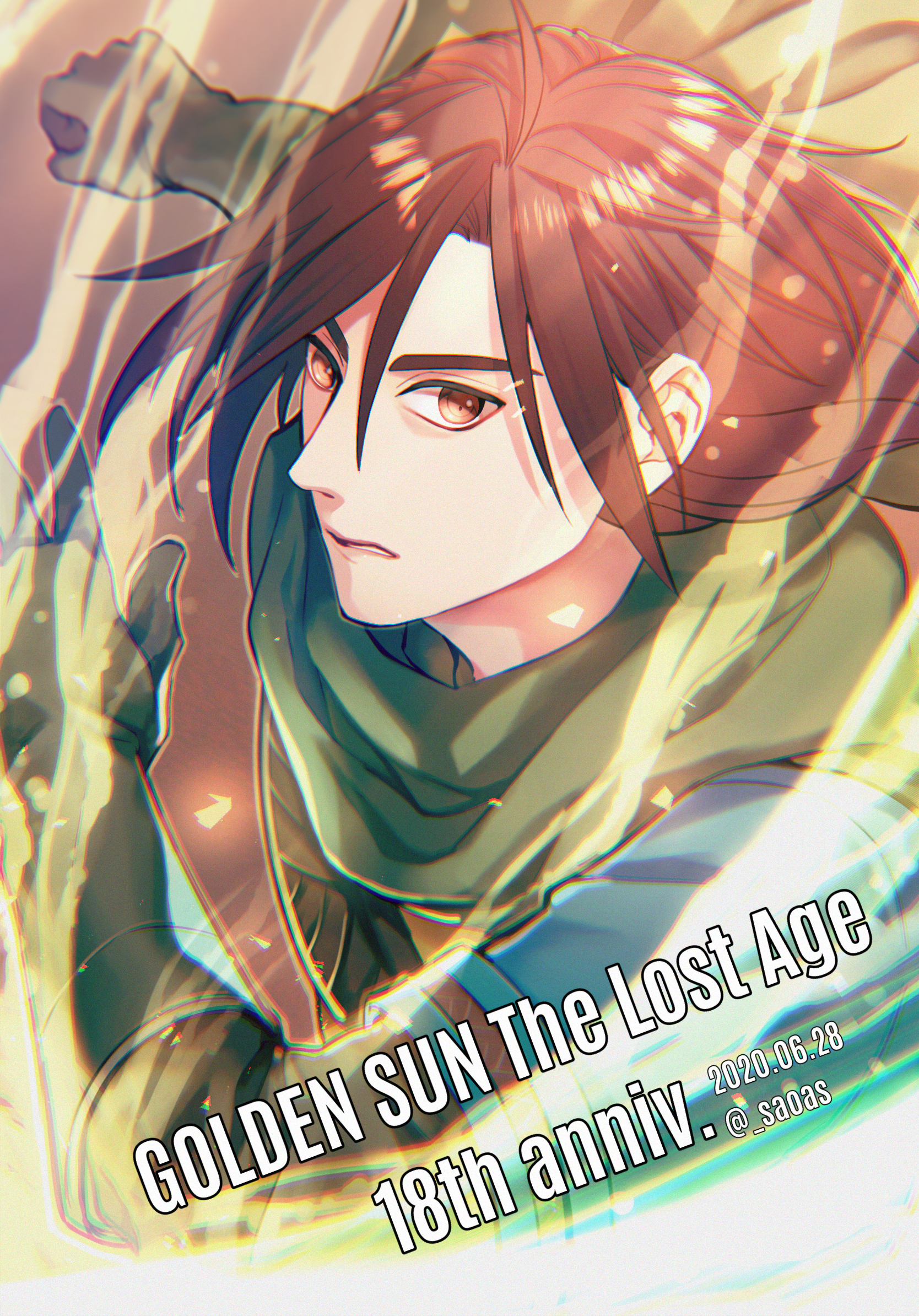 1boy 2020 artist_name brown_eyes brown_hair clenched_hand felix_(golden_sun) gloves golden_sun green_scarf green_tunic highres looking_at_viewer male_focus oas scarf short_sleeves tunic