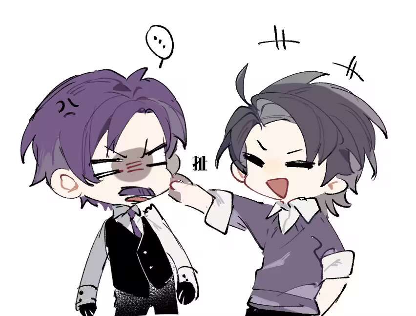 ... 16personalities 2boys ahoge architect_(16personalities) black_gloves black_hair black_vest cheek_pinching closed_eyes collared_shirt debater_(16personalities) gloves multiple_boys necktie open_mouth parted_bangs pinching purple_hair purple_necktie purple_sweater shirt smile speech_bubble sweater ugo666 upper_body vest white_shirt