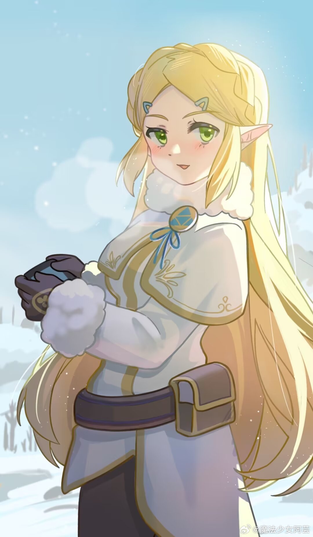 1girl black_gloves blonde_hair braid breasts chinese_commentary coat commentary_request crown_braid from_side fur-trimmed_coat fur_trim gloves green_eyes hair_ornament hairclip highres holding long_hair looking_at_viewer medium_breasts nintendo pointy_ears pouch princess_zelda sheikah_slate snow solo the_legend_of_zelda the_legend_of_zelda:_breath_of_the_wild very_long_hair watermark weibo_watermark white_coat yun_(dl2n5c7kbh8ihcx)