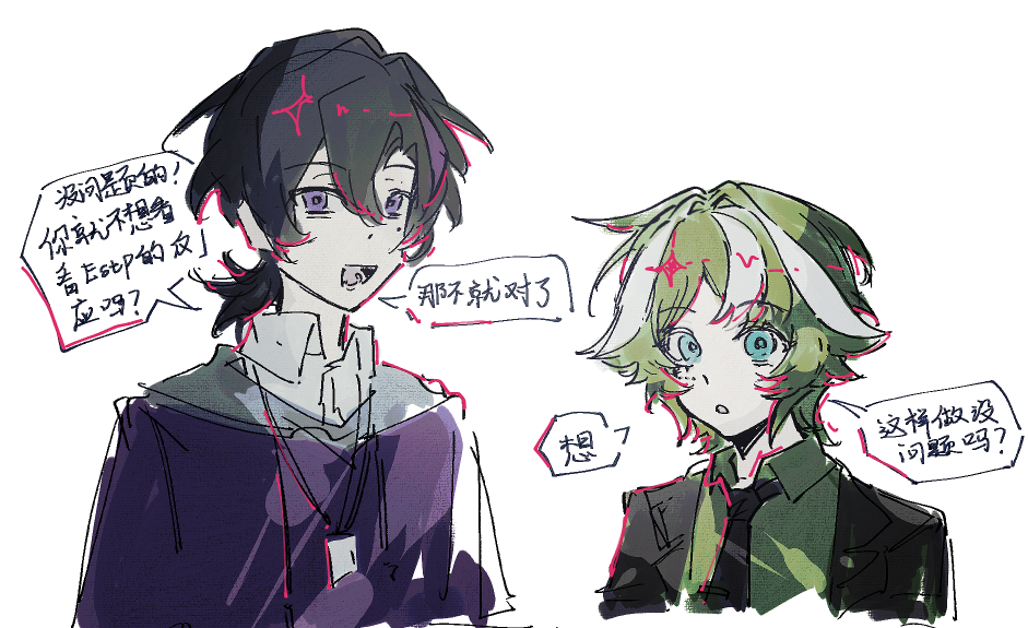 16personalities 1boy 1girl aqua_eyes black_hair black_jacket black_necktie campaigner_(16personalities) chinese_text collared_shirt debater_(16personalities) green_hair green_shirt id_card jacket looking_at_viewer low_ponytail multicolored_hair necktie open_mouth ponytail purple_eyes purple_sweater shirt short_hair simple_background smile speech_bubble streaked_hair sweater translation_request upper_body white_background white_shirt xuxi239756