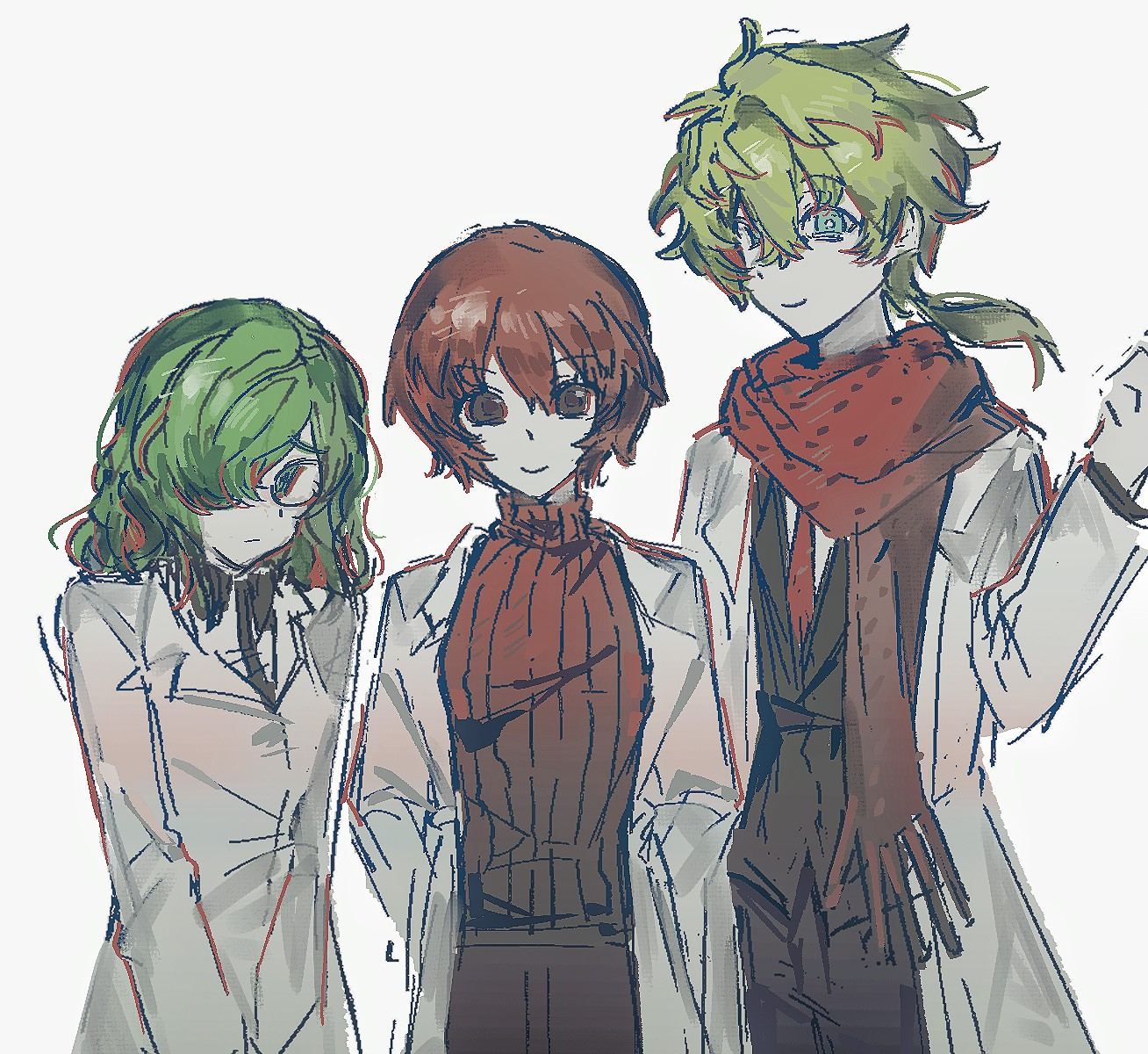 1boy 2girls aqua_eyes brown_eyes brown_hair closed_mouth coat cowboy_shot green_eyes green_hair hair_over_one_eye hannakii highres hoemii kimi_ga_shine lab_coat lapels long_hair low_ponytail midori_(kimi_ga_shine) multiple_girls notched_lapels ponytail ribbed_sweater short_hair simple_background smile sweater white_background white_coat xuxi239756