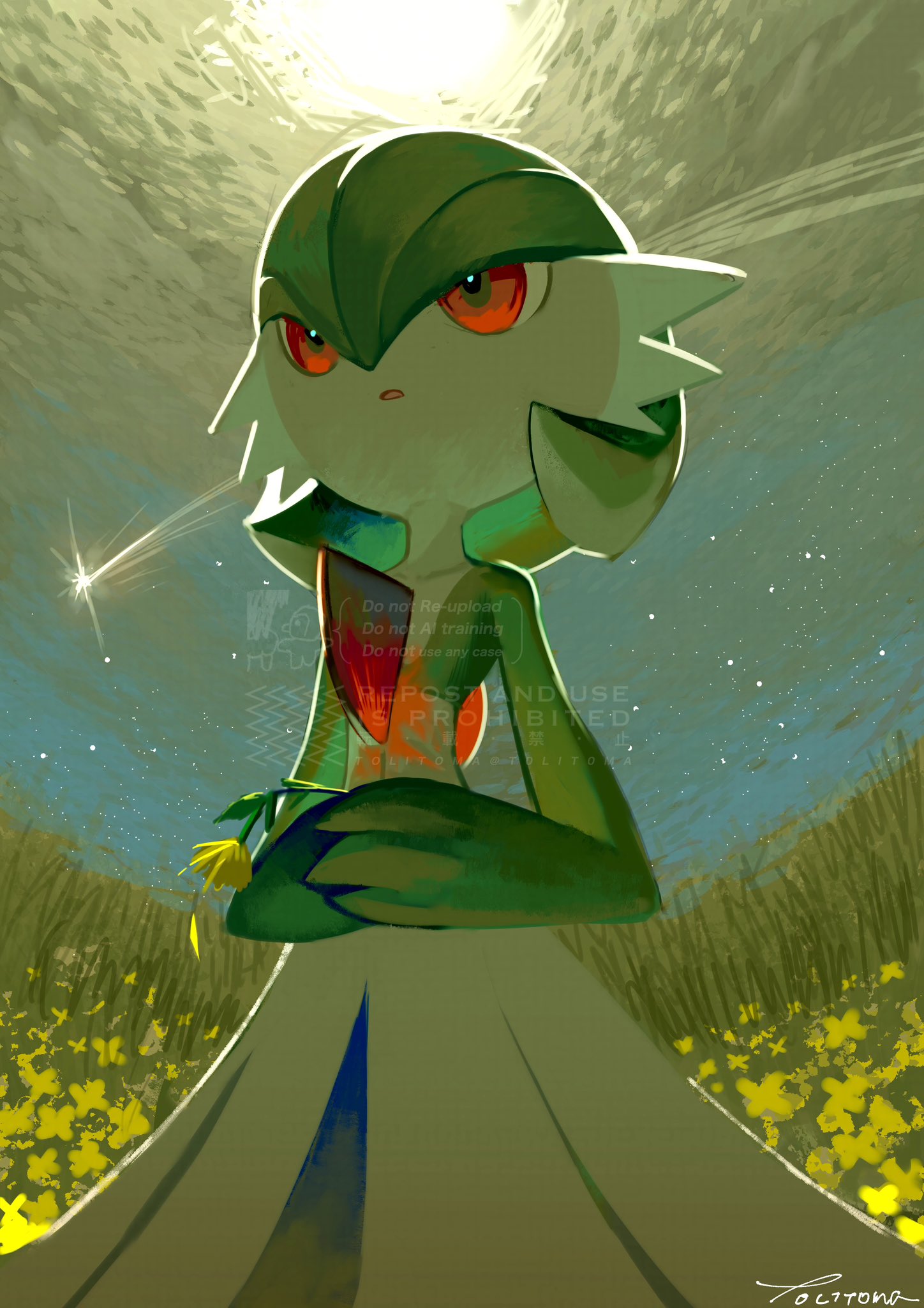 :o =_(9_yawbus) colored_skin dress flower gardevoir gen_3_pokemon green_hair hair_between_eyes highres holding holding_flower looking_up nintendo open_mouth own_hands_together pokemon pokemon_(creature) pokemon_focus red_eyes signature solo white_dress white_skin