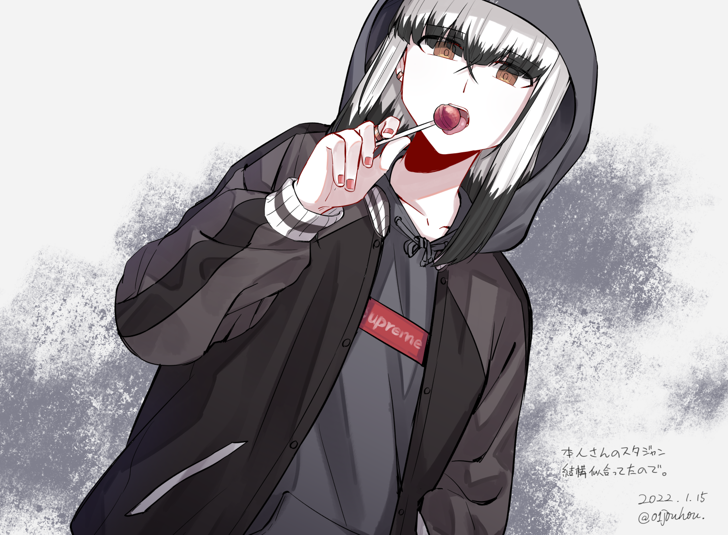 1girl black_hair black_jacket blunt_bangs brown_eyes candy casual collarbone colored_tips commentary_request dated dutch_angle food grey_hoodie hand_up holding holding_candy holding_food hood hood_up hooded_jacket hoodie jacket jouhou lollipop long_sleeves looking_at_viewer medium_hair multicolored_hair open_clothes open_jacket open_mouth red_nails satsuki_yomi solo supreme_(brand) toji_no_miko tongue tongue_out translation_request twitter_username white_hair