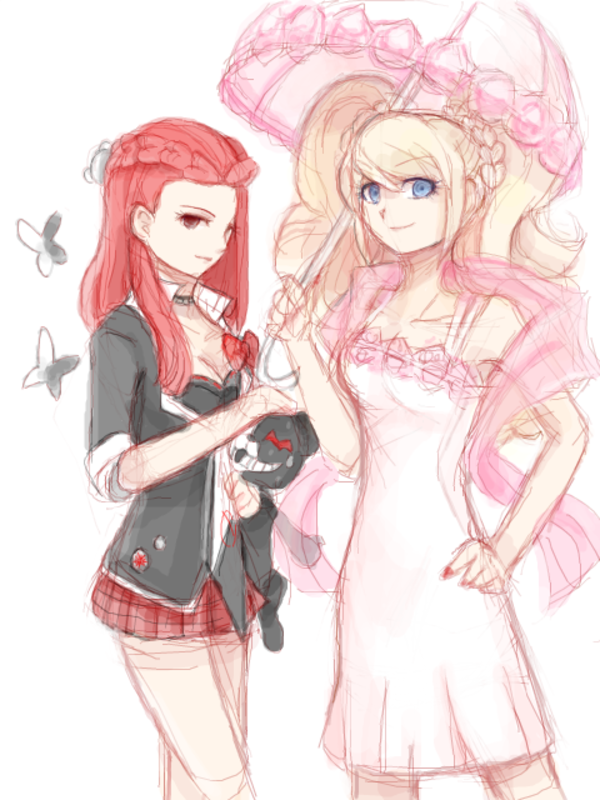 2girls ace_attorney black_shirt blonde_hair blue_eyes cosplay costume_switch crossover dahlia_hawthorne danganronpa:_trigger_happy_havoc danganronpa_(series) enoshima_junko female_focus fingernails long_hair looking_at_viewer matching_hair/eyes monokuma multiple_girls nail_polish pleated_skirt red_eyes red_hair red_nails red_skirt shirt simple_background sketch skirt twintails white_background