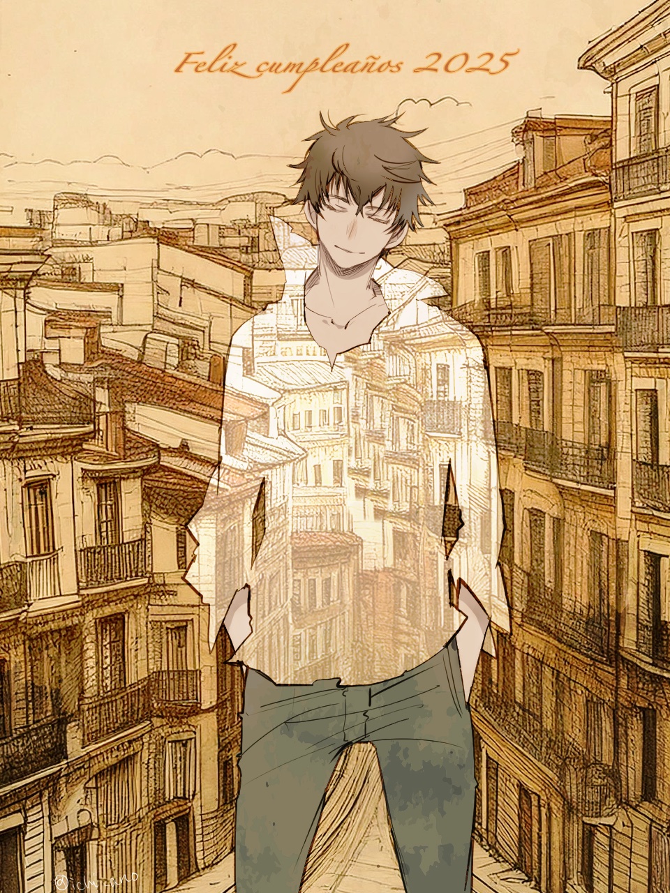 1boy axis_powers_hetalia brown_hair building closed_eyes cowboy_shot hands_in_pockets happy_birthday highres ichi_(ringogogo777) male_focus orange_sky pants sepia shirt short_hair sky smile solo spain_(hetalia) spanish_text white_shirt
