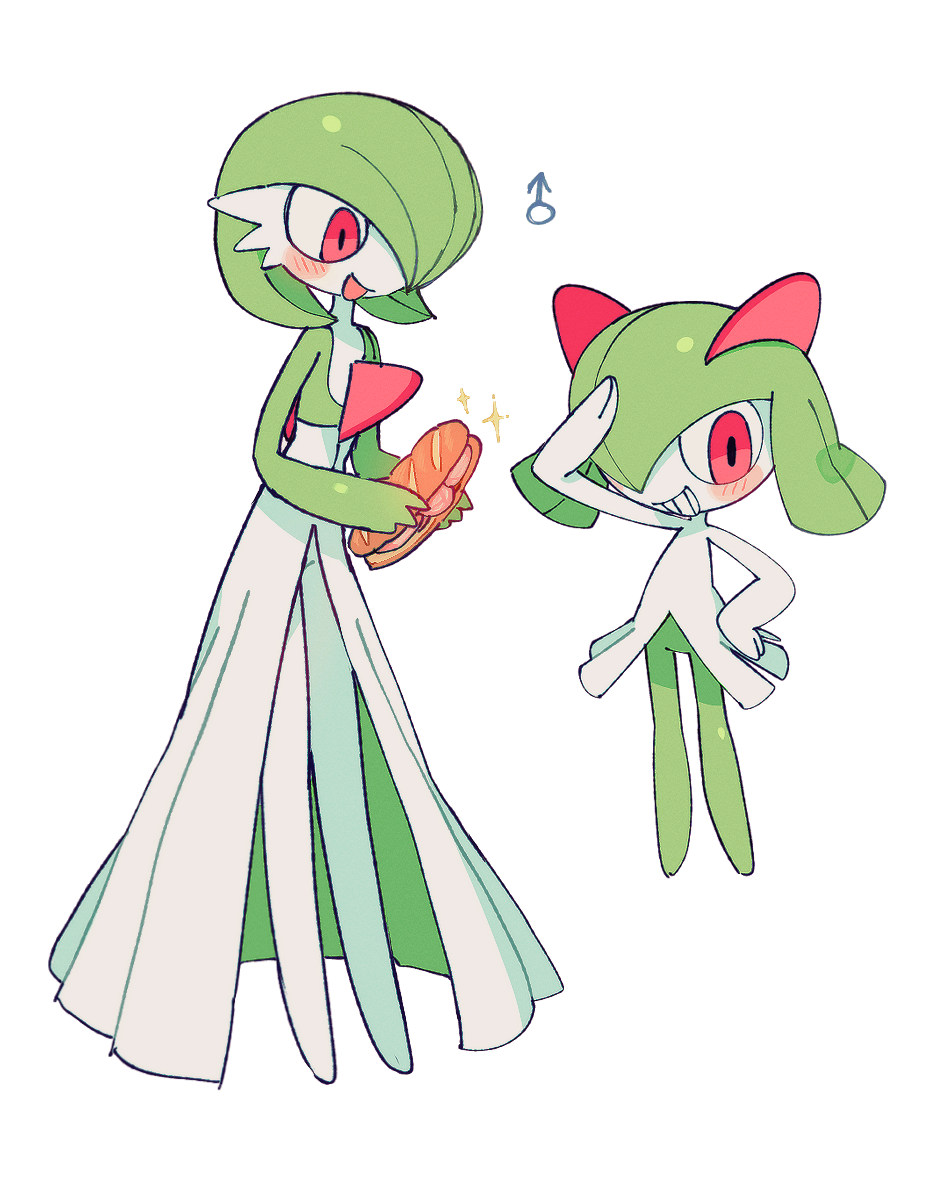 2boys arm_up blush blush_stickers bob_cut colored_skin flat_chest food full_body gardevoir gen_3_pokemon green_skin grin hair_over_one_eye hand_on_own_hip hands_up happy holding holding_food holding_sandwich kirlia kojirou_(mesurf1) legs looking_afar looking_at_another male_focus mars_symbol medium_hair multicolored_skin multiple_boys nintendo no_feet one_eye_covered open_mouth pokemon pokemon_(creature) red_eyes salute sandwich short_hair sidelocks simple_background smile sparkle standing submarine_sandwich teeth trap two-tone_skin white_background white_skin