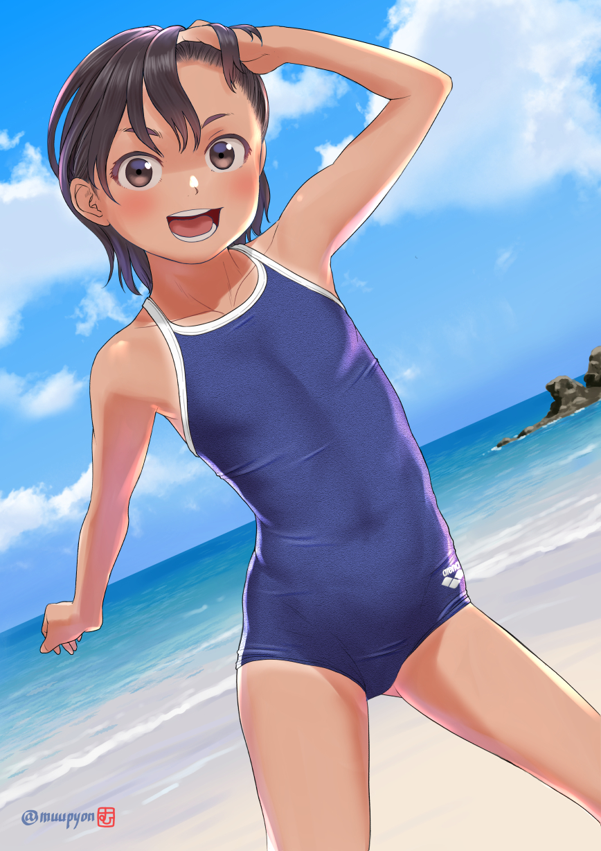1girl arena_(company) artist_logo beach black_hair blue_one-piece_swimsuit blue_sky brown_eyes child cloud commentary_request competition_school_swimsuit day dutch_angle flat_chest highres horizon logo mu-pyon ocean one-piece_swimsuit one-piece_tan open_mouth original outdoors school_swimsuit short_hair sky smile solo standing swimsuit tan tanline twitter_username