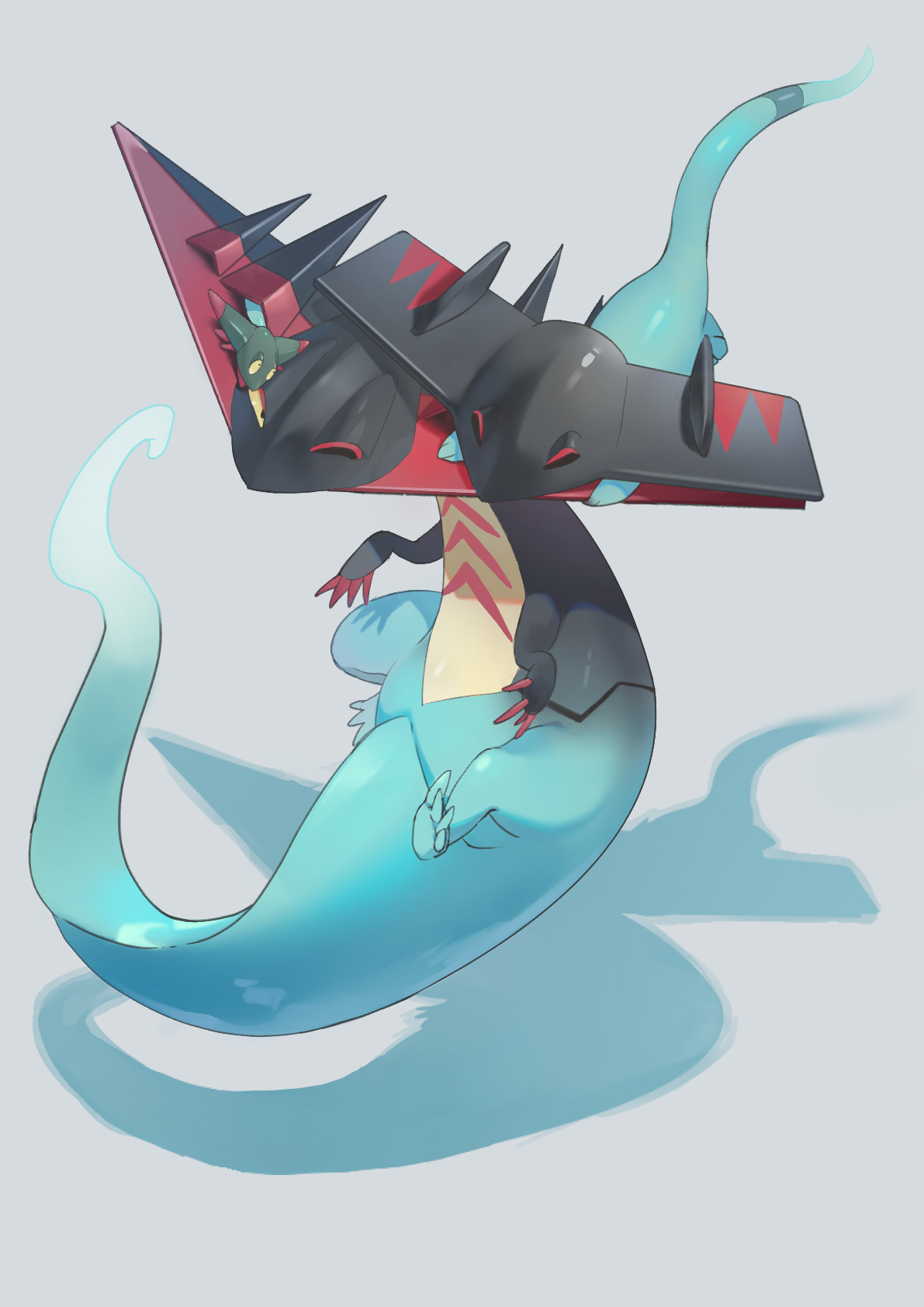 claws closed_eyes commentary cuddling dragapult drakloak dreepy evolutionary_line gen_8_pokemon grey_background highres kanataeni nintendo no_humans one_eye_closed pokemon pokemon_(creature) pokemon_focus yellow_eyes