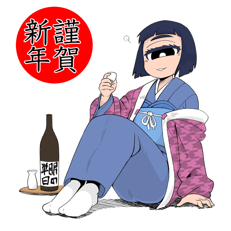 1girl alcohol black_eyes blue_hair blue_kimono bottle choko_(cup) cup cyclops full_body holding holding_cup japanese_clothes kimono one-eyed original sake_bottle short_hair sitting smile socks solo white_background white_socks yakochu
