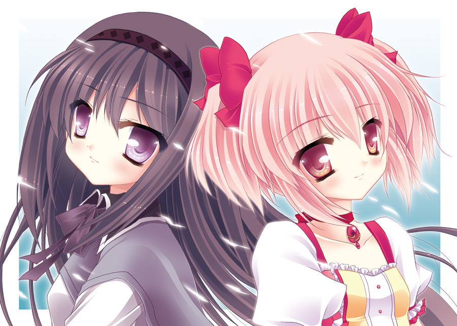 10s 2girls akemi_homura akemi_homura_(magical_girl) bad_id bad_pixiv_id black_hair blush choker hairband kaname_madoka kaname_madoka_(magical_girl) light_smile long_hair magical_girl mahou_shoujo_madoka_magica mahou_shoujo_madoka_magica_(anime) mizuki_yuuma multiple_girls pink_eyes pink_hair purple_eyes short_hair twintails upper_body