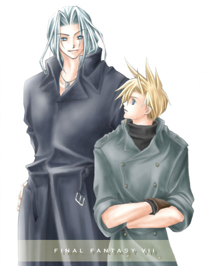 2boys alternate_costume black_coat blonde_hair blue_eyes brown_gloves cloud_strife coat copyright_name crossed_arms dog_tags final_fantasy final_fantasy_vii gloves grey_hair hair_intakes hand_on_own_hip height_difference high_collar long_hair looking_at_another male_focus multiple_boys parted_bangs parted_lips rendezvous sephiroth short_hair simple_background smile spiked_hair third-party_source turtleneck upper_body white_background