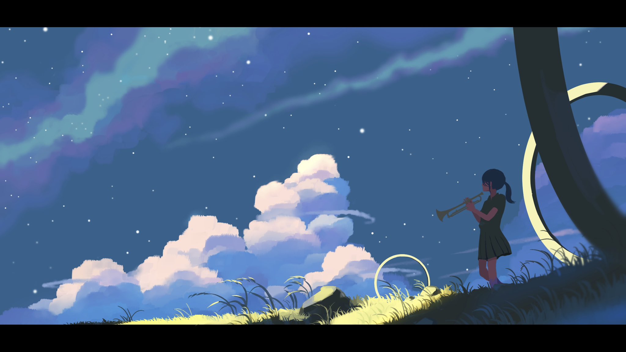 1girl cloud commentary_request faceless grass highres holding holding_instrument instrument music night original playing_instrument sky solo sunlight taizo_(taizo_03)